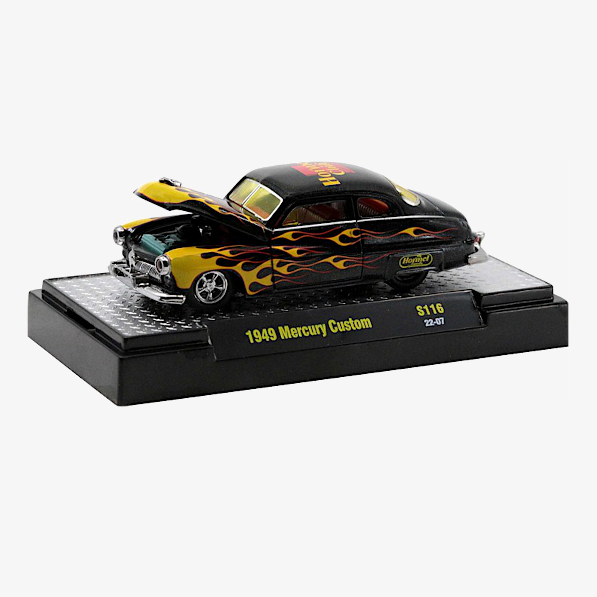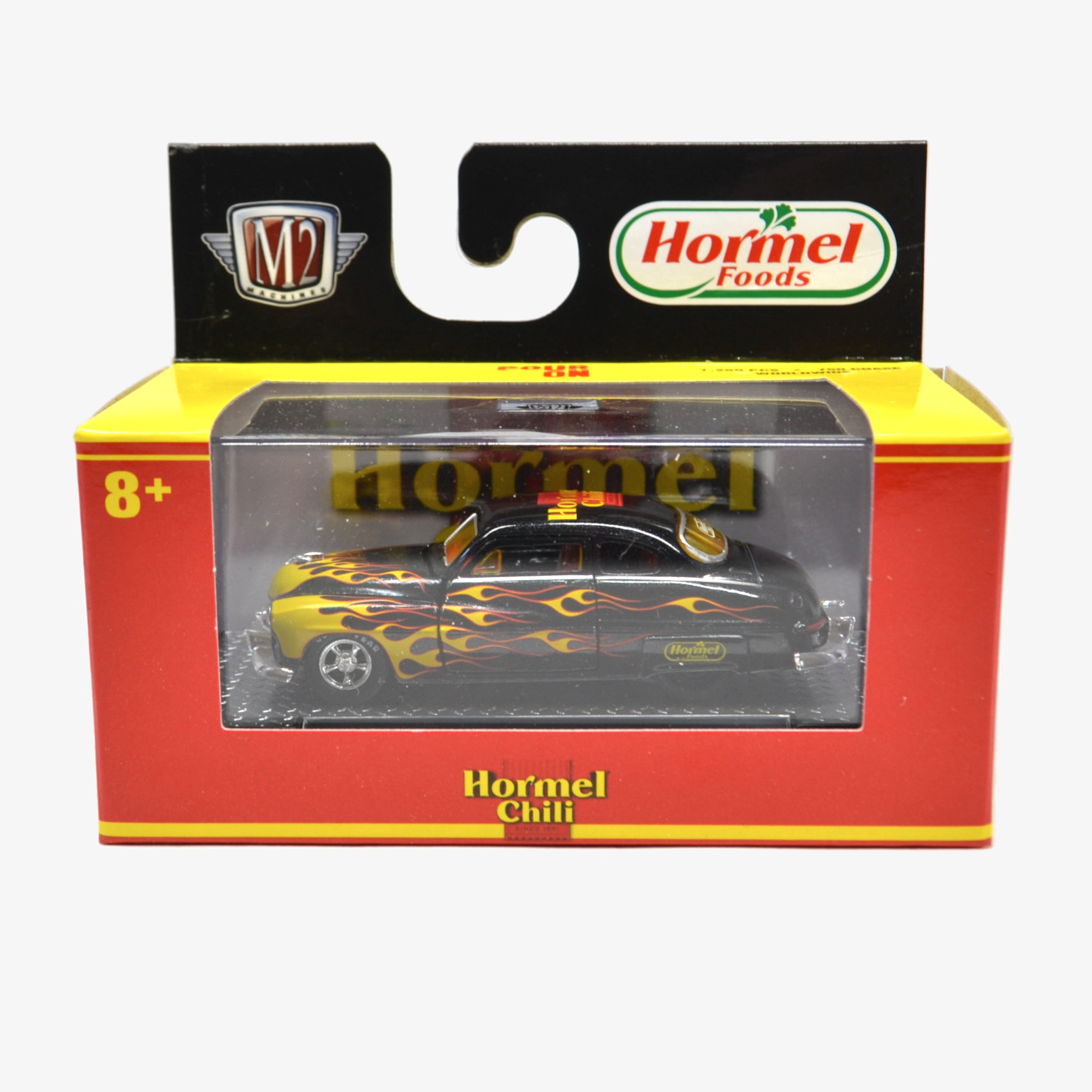 This 1949 Mercury Custom model is a unique collectible from M2 Machines. At 1:64 scale, or about 2.75″ long, this die-cast model represents a black 1949 Mercury Custom with yellow flames. The car has chrome wheels and bumpers, which contrast nicely with its paint. The Hormel Chili logo appears on the hood, on the back window, and on each side. Someone donated this model new in its original sealed box. Although the box shows mild wear from storage, this item would make a great gift.
