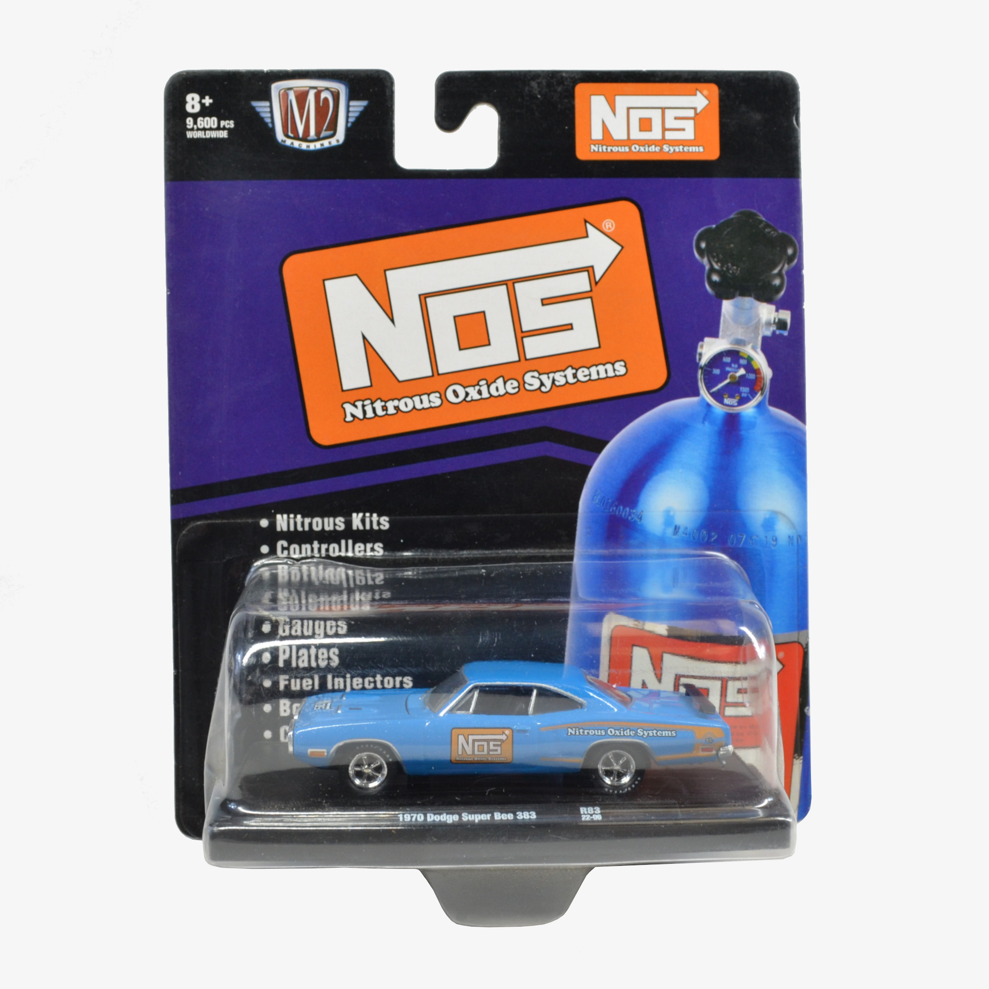 This is a 1:64 scale Super Bee Die-cast Model Car representing a 1970 Dodge Super Bee 383. M2 Machines created this detailed replica. The car measures about 3″ long. It features a solid, attractive blue paint color. This model includes shiny chrome wheels. You will notice the Nitrous Oxide Systems (NOS) logo on both the doors and the hood. A supporter donated this model new.