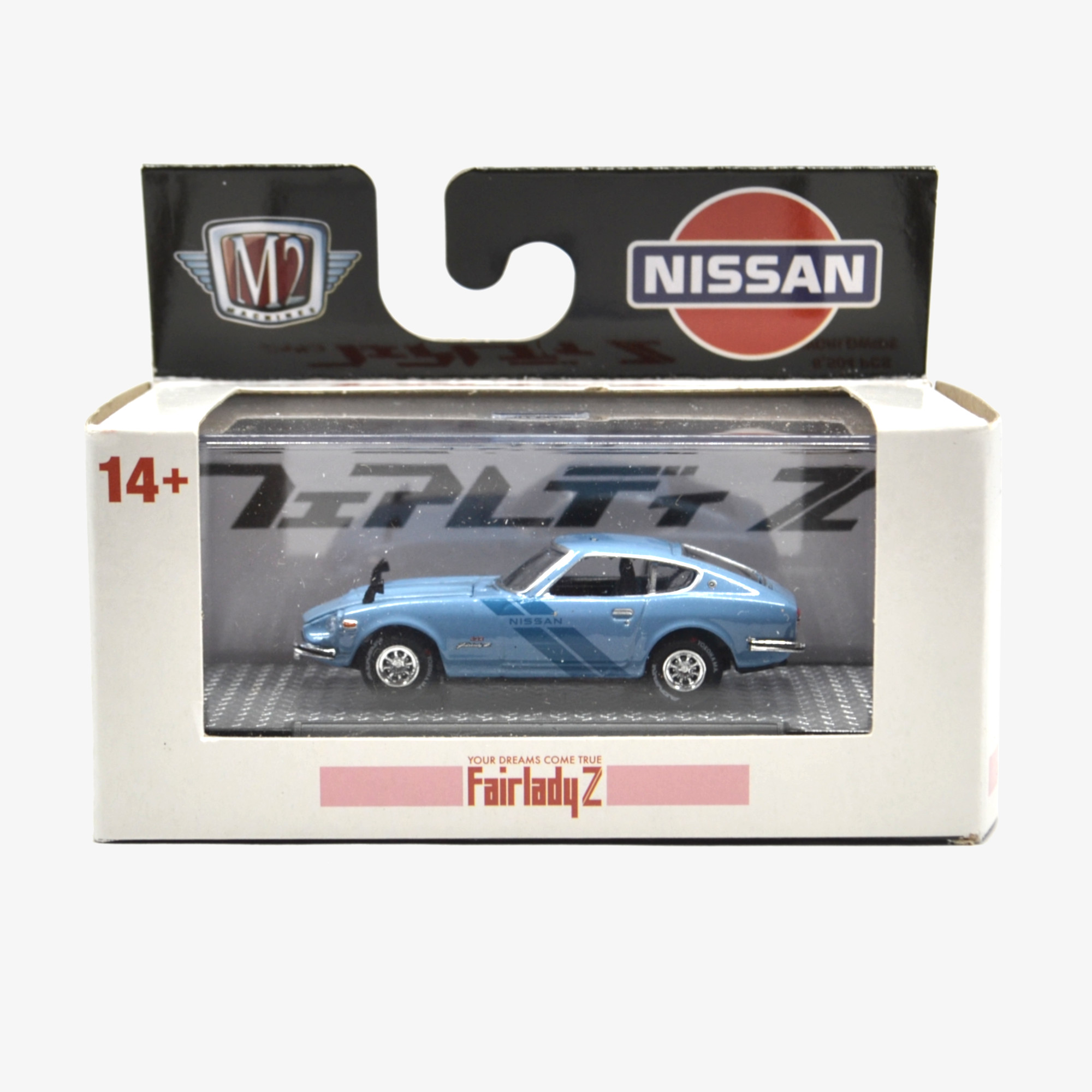 This 1970 Nissan Fairlady Z432 model is a unique collectible from M2 Machines. At 1:64 scale, or about 3″ long, this die-cast model represents a classic powder blue 1970 Nissan Fairlady Z432. The car has chrome wheels and bumpers, which contrast nicely with its paint. Two diagonal Nissan stripes appear on the sides. Someone donated this model new in its original sealed box. Although the box shows mild wear from storage, this item would make a great gift.