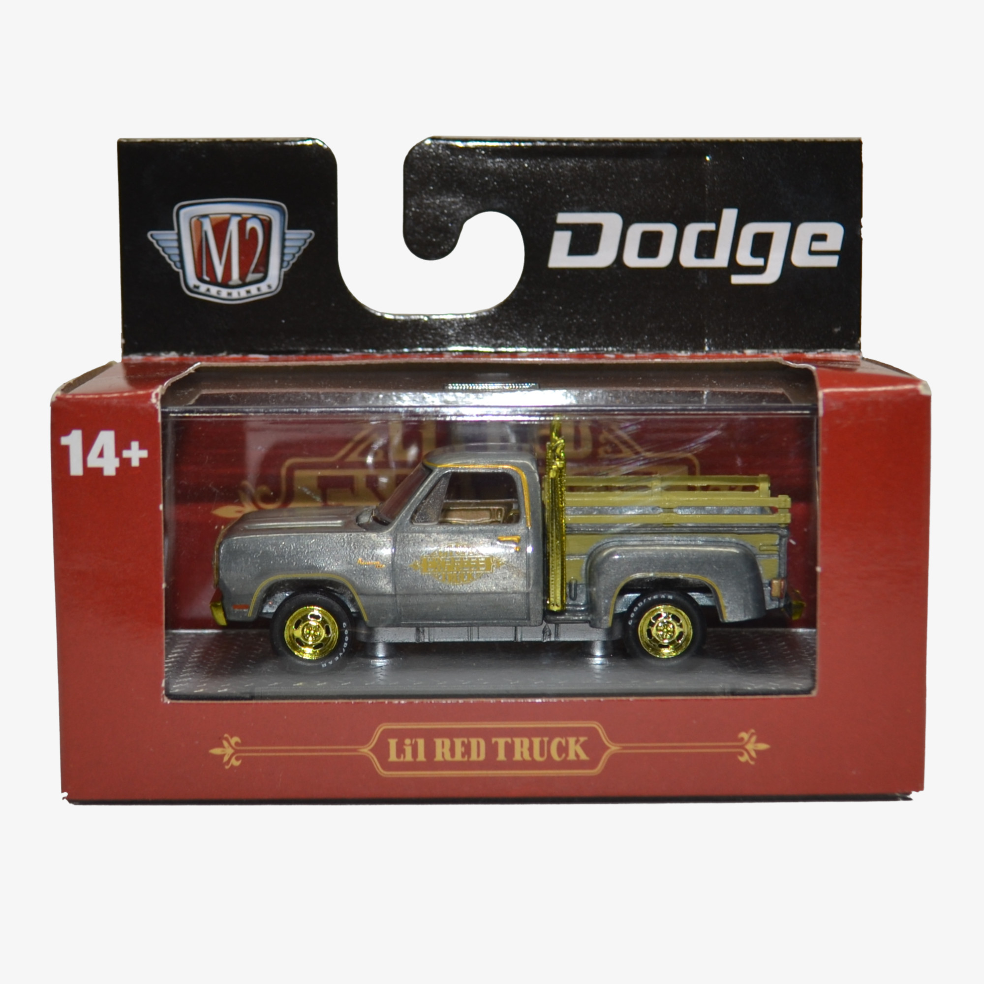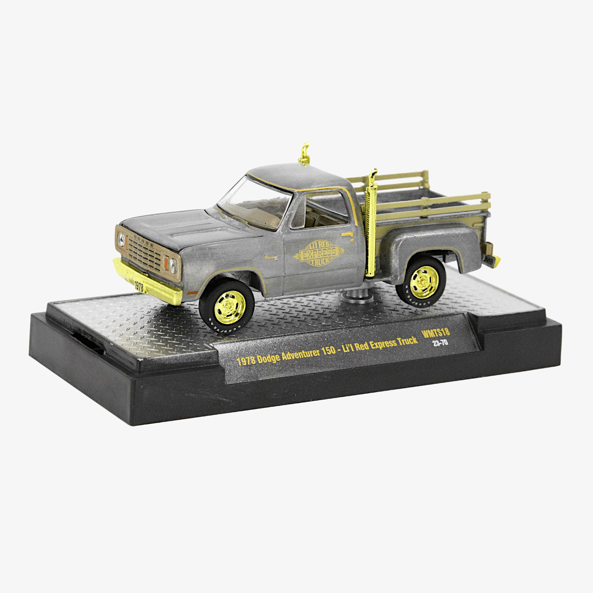 This highly collectible icy blue 1978 Dodge Adventurer model has sold on eBay over the last couple of years for between about $105.00 and $180.00. We’re selling it here for a notably lower price. It is a 1:64 scale die-cast model from M2 Machines, representing an icy blue 1978 Dodge Adventurer 150 Li’l Red Express Truck. This model, which measures about 3″ long, features metallic green chrome bumpers and wheels, as well as realistic rubber tires. Someone donated this model new in its original box, which shows mild wear from storage.