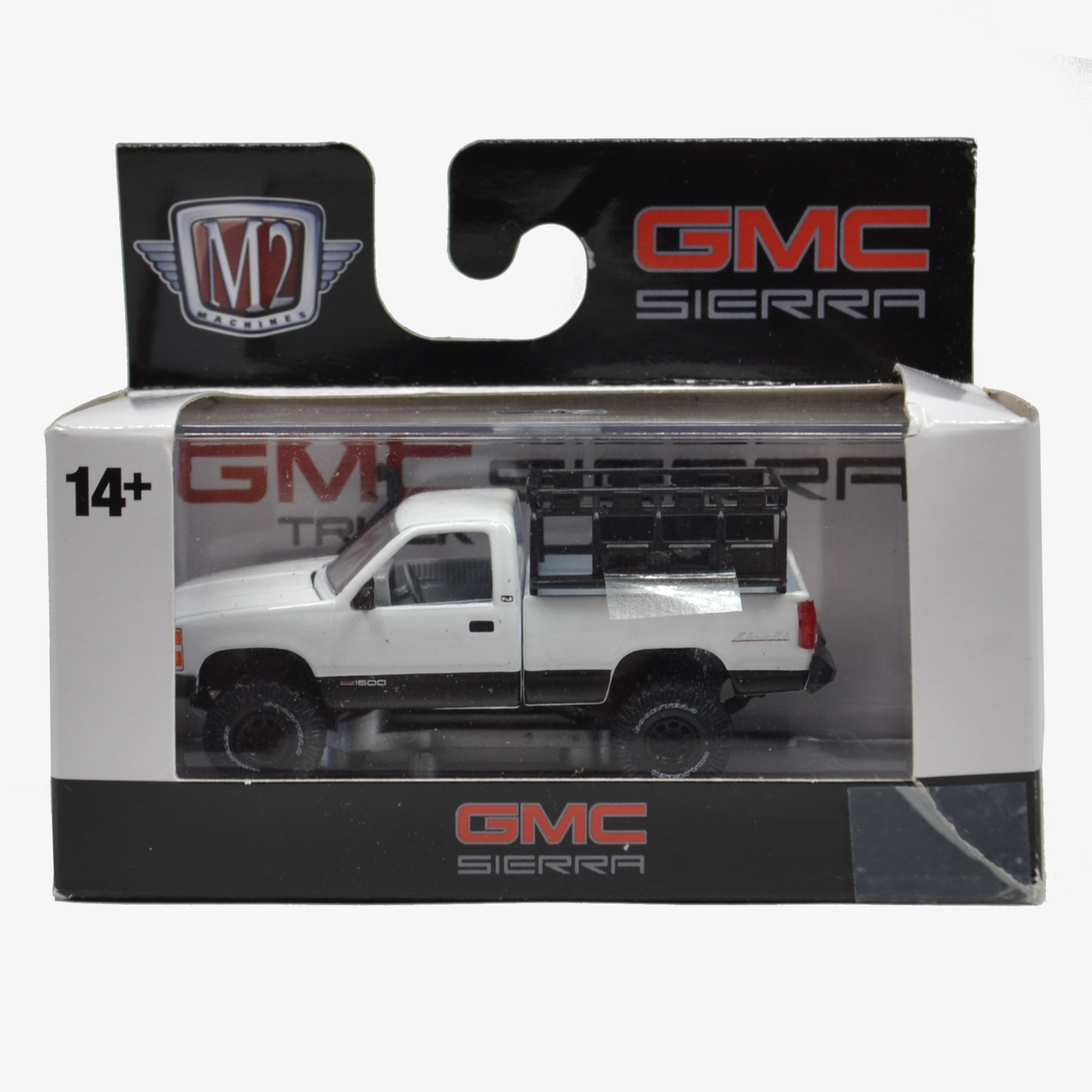 This 1998 GMC Sierra 1500 model is a unique collectible from M2 Machines. At 1:64 scale, or about 3″ long, this die-cast model represents a classic white 1998 GMC Sierra 1500 4×4. The truck has black wheels, bumpers, and a black bed rack, which contrast nicely with its white paint. Someone donated this model new in its original sealed but torn box (0.5″ tear on top, 0.75″ taped tear on front). Despite the two tears and other mild wear from storage, the box is sealed and would make a great gift.
