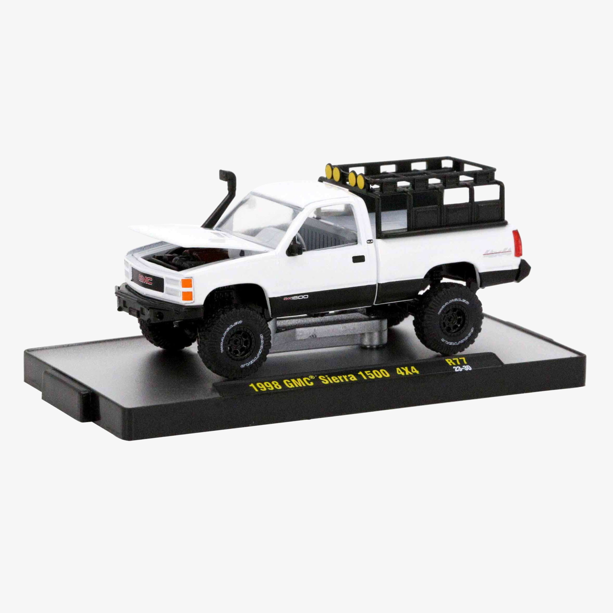 This model truck captures the classic design of the 1998 GMC Sierra. The bright white color stands out, while the black accents give it a sleek look. The bed rack, in addition, gives it a rugged, authentic feel. This model is a great addition to any collection. It celebrates a classic American vehicle.