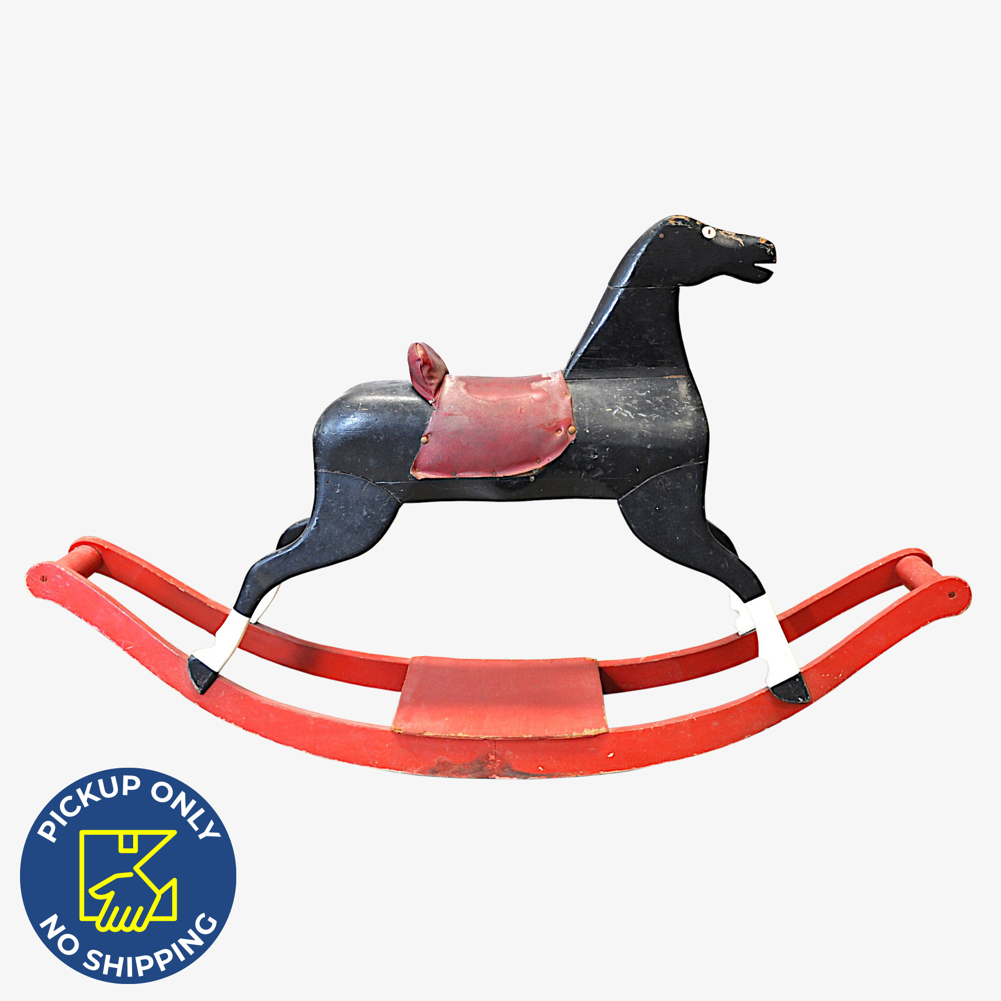 The rocking horse, which measures about 54L x 31H x 9″D, features a solid wooden construction, painted black, with contrasting red on the saddle and rockers.
