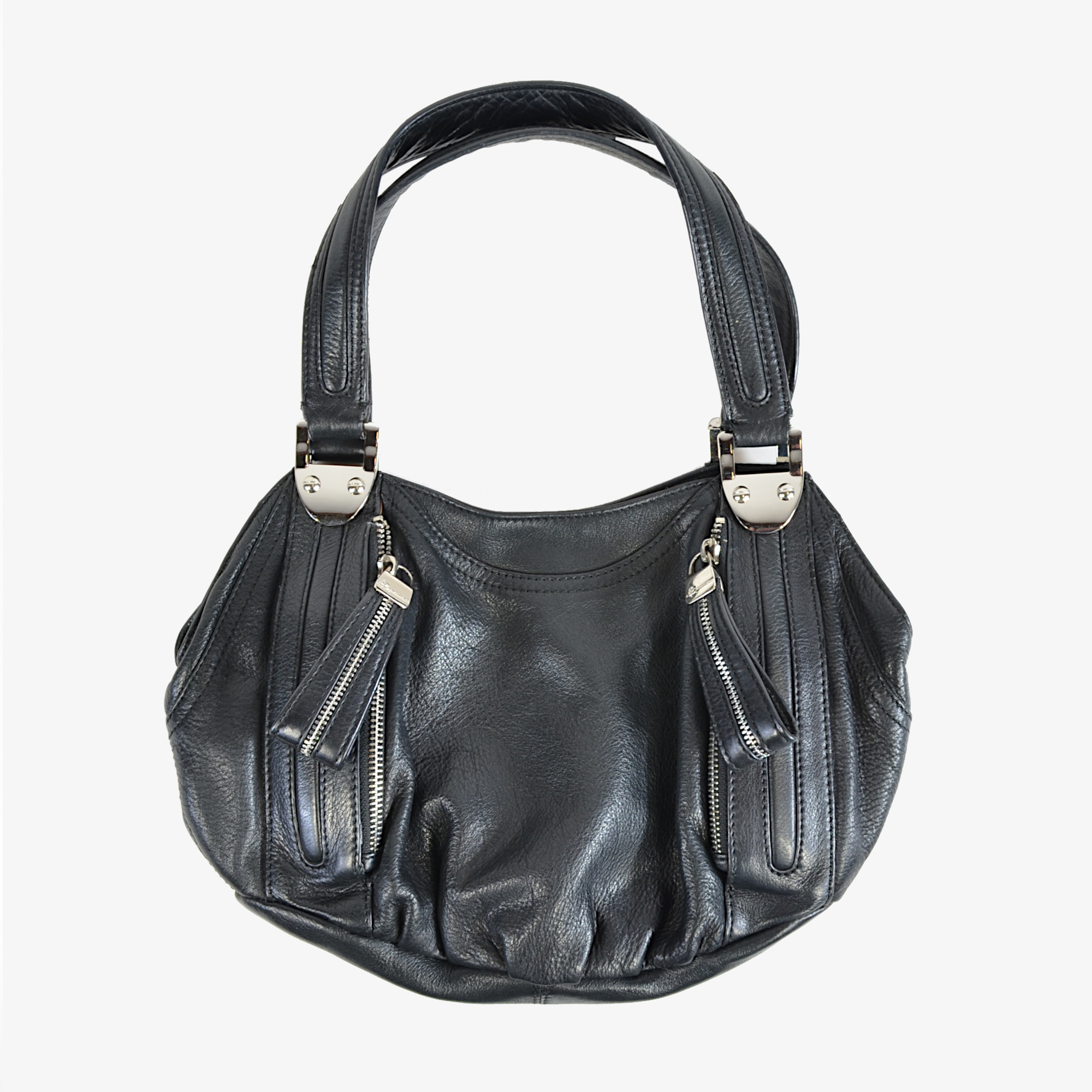 On one side of the bag, you will find two vertical zippers. Each zipper has a 3″ long leather pull tab for a comfortable grip. These tabs feature a stylized mock zipper design to match the real zippers. On the other side, a small slip pocket holds your essentials. This pocket easily fits a small phone or your keys for quick access. The handbag uses chrome-plated hardware for a polished and durable finish. Two nonadjustable leather straps provide a secure way to carry the bag. Each strap measures 1.13″ wide for extra comfort on your shoulder; they offer a 7″ arch from the top edge of the purse.