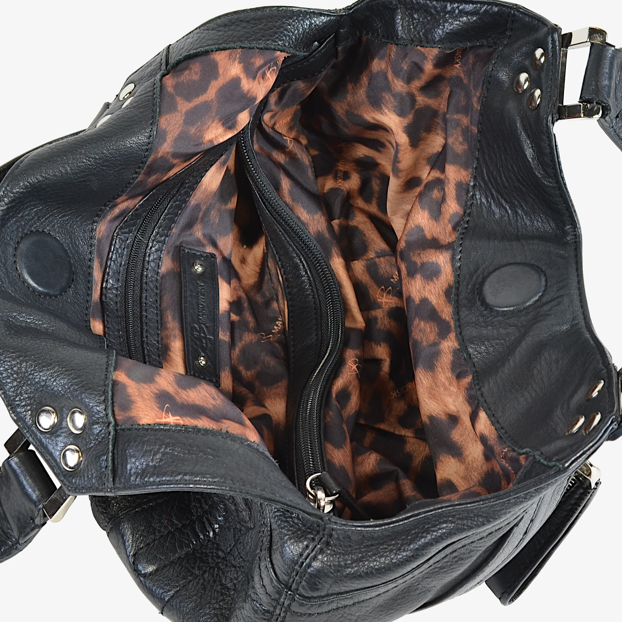 The main compartment of this black leather handbag has a magnetic closure. Inside, a vibrant cheetah print lining gives the bag a unique personality. You will find a leather B. Makowsky logo tag inside the lining. To help with organization, the bag includes a zippered middle divider pocket. This shallow but long pocket splits the main space into two handy sections. Also, a smaller zippered pocket sits against the interior wall for extra security. Both interior zippers include leather pull tabs to match the exterior style. You can store your wallet, makeup, and daily tools in these separate areas.