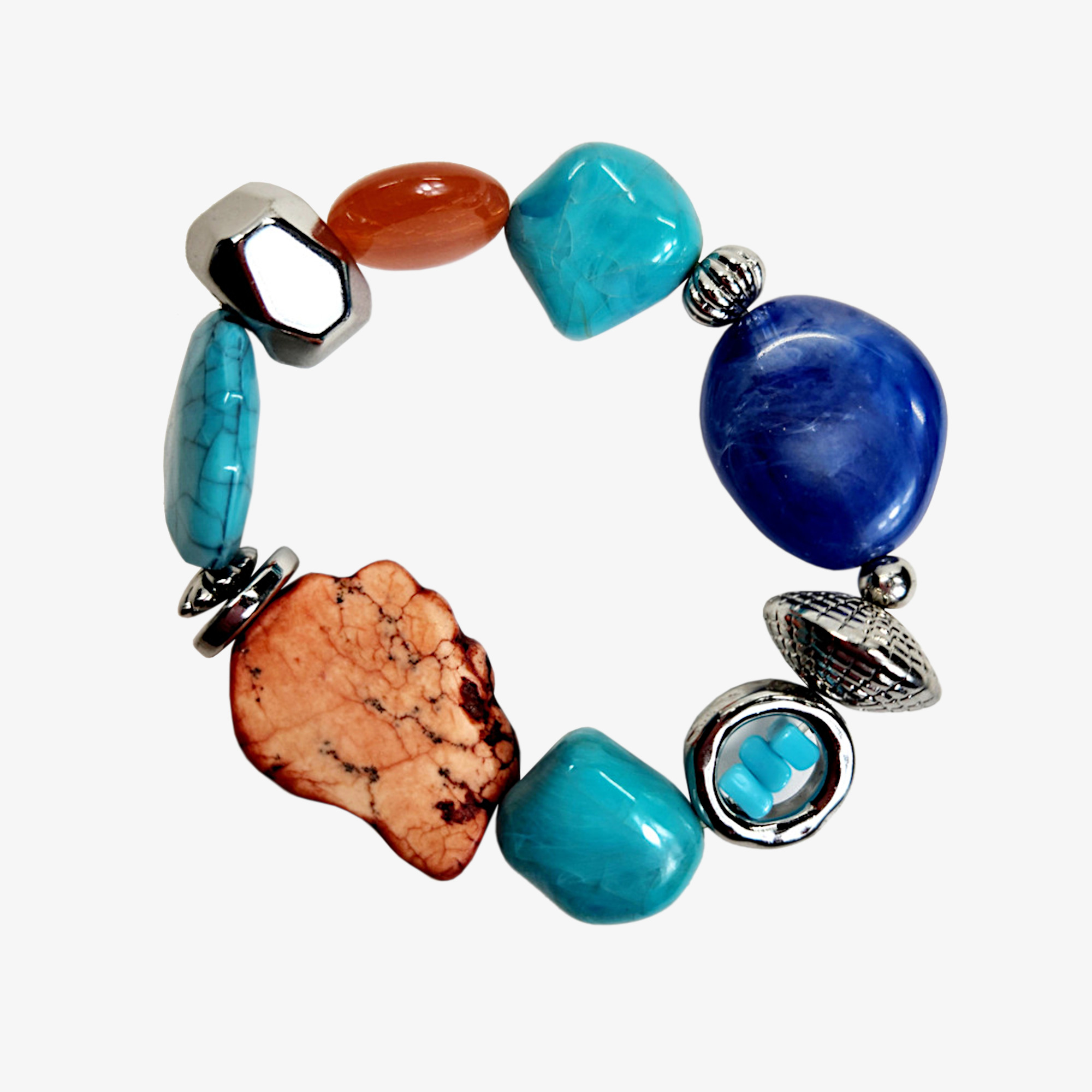 The natural stones showcase beautiful earthy tones. The orange and turquoise colors create a lively contrast. Each stone displays its unique character. The dark blue cabochon adds a touch of mystery. These gems bring a vibrant energy to the bracelet. They highlight the beauty of natural materials.
