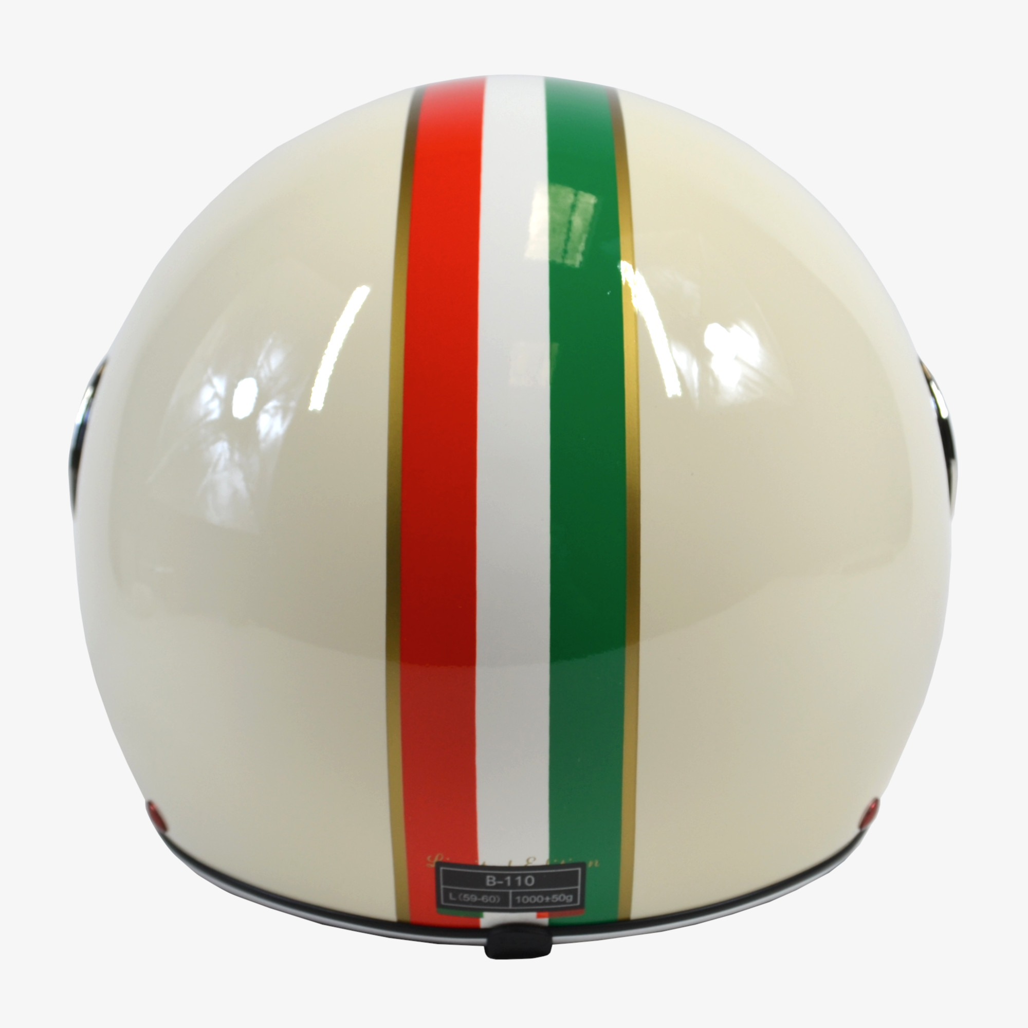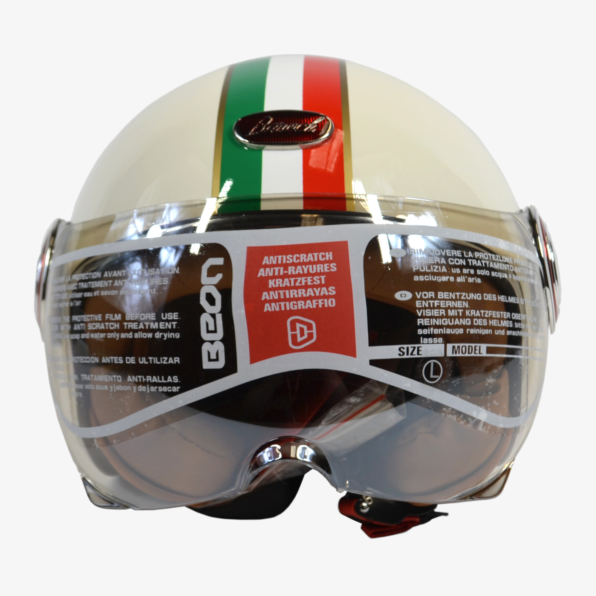 This Beon Retro Motorcycle Helmet offers professional safety and comfort. Size large, this half helmet has a beige color with classic red and green stripes. It measures 11L x 9W x 9″ H. The ABS shell construction provides excellent protection. It includes a clear visor and a quick-release buckle you can easily release with one gloved hand. This helmet meets or exceeds DOT FMVSS 218 certification and complies with all U.S. regulations. Use it for motorcycles, scooters, mopeds, bicycles, and other wheeled vehicles. This helmet was donated brand new with tags and includes a black fabric drawstring storage bag.