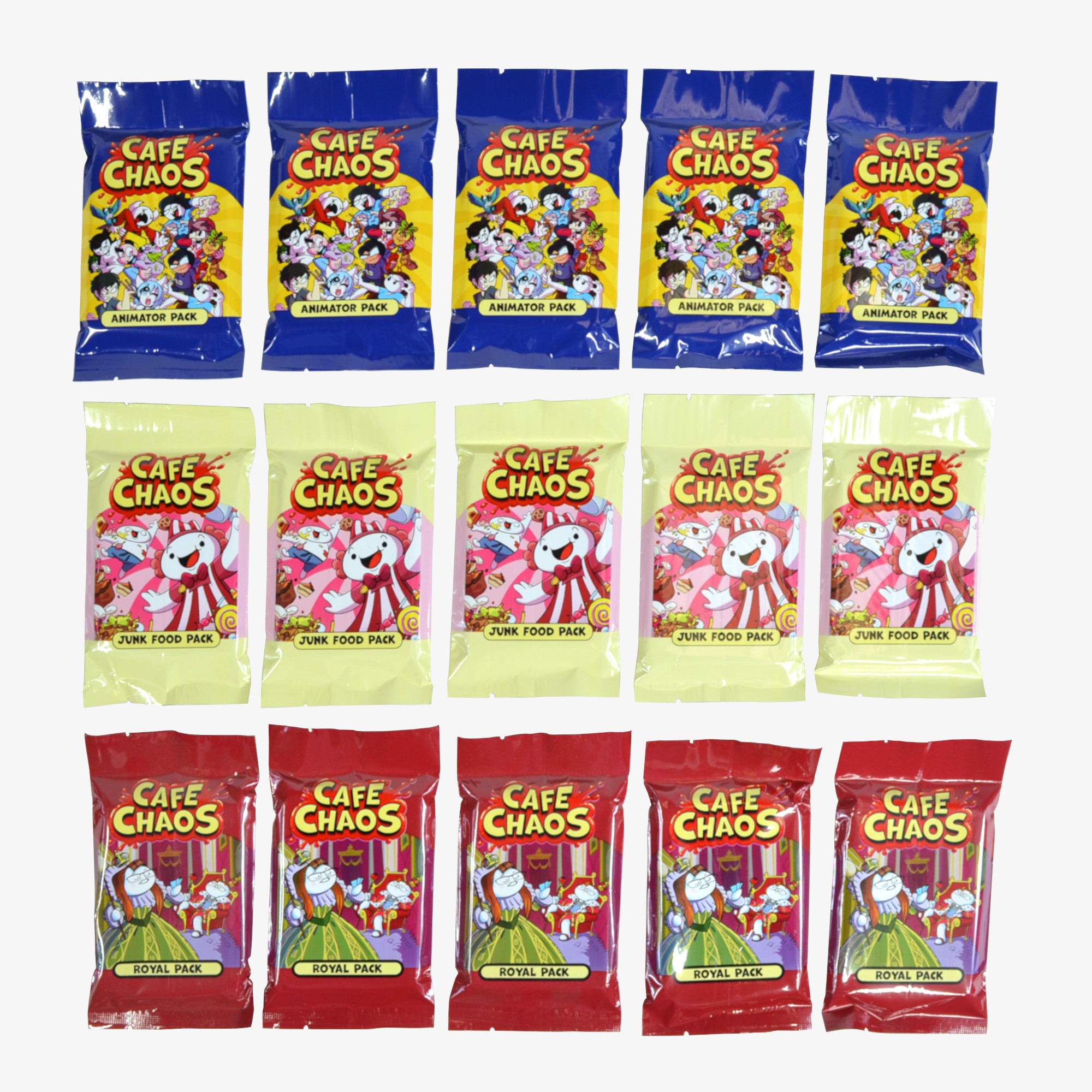 This Cafe Chaos Expansion Packs Bundle features fifteen individual expansion packs to grow your Cafe Chaos card game collection. You will receive five Animator packs, five Junk Food packs, and five Royal packs in this set. Together, these packs provide a total of 480 new cards to vary your gameplay experience. These accessories come from the popular world of James Rallison, who fans know as TheOdd1sOut. On websites like eBay, these expansion packs usually sell for an average of $5.00 each. This bundle offers a fantastic opportunity to own many expansions at a very affordable price. You can find other Cafe Chaos products and replacement parts by visiting our online store. These cards allow you to keep your game nights exciting and full of surprises.