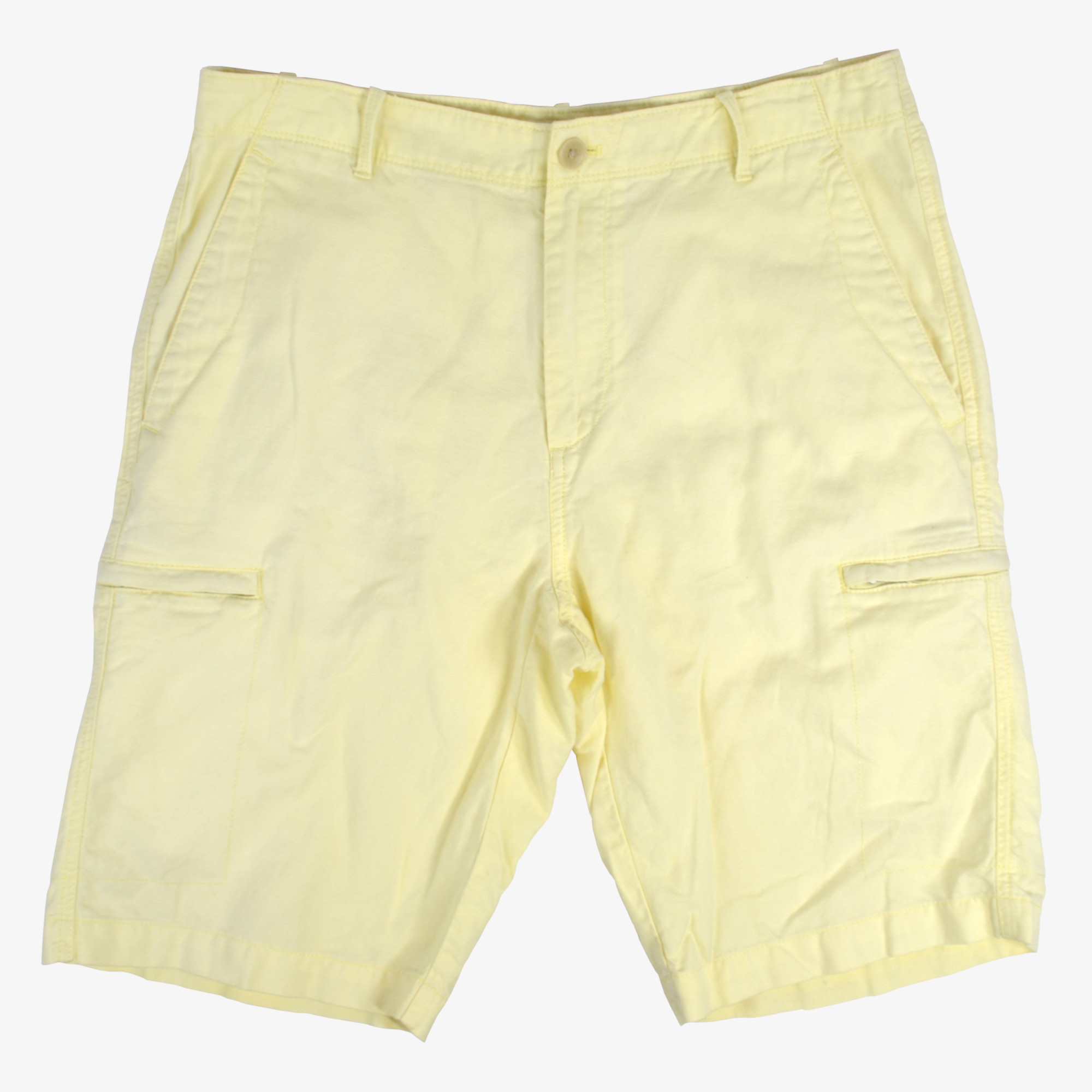 These light yellow Calvin Klein Men’s Cargo Shorts, size 32, offer a refreshing summery look. Made from a blend of 52% linen and 48% cotton, they’re comfortable to wear while looking stylish. These shorts, with an outseam of 20″, have two side pockets, two lower front pockets each with a zippered closure, and two back pockets. This pre-owned pair is in very good condition, showing light wear and laundering.