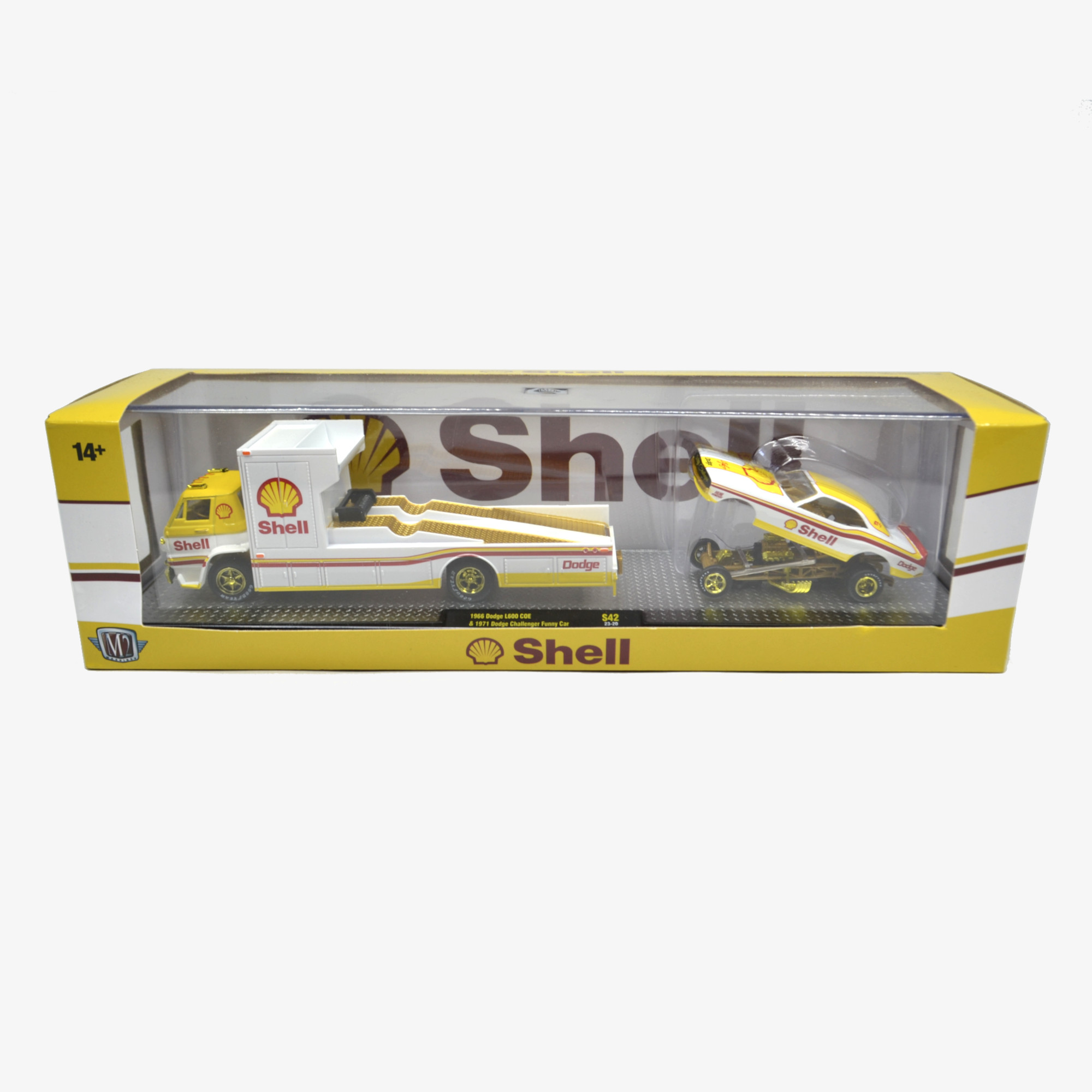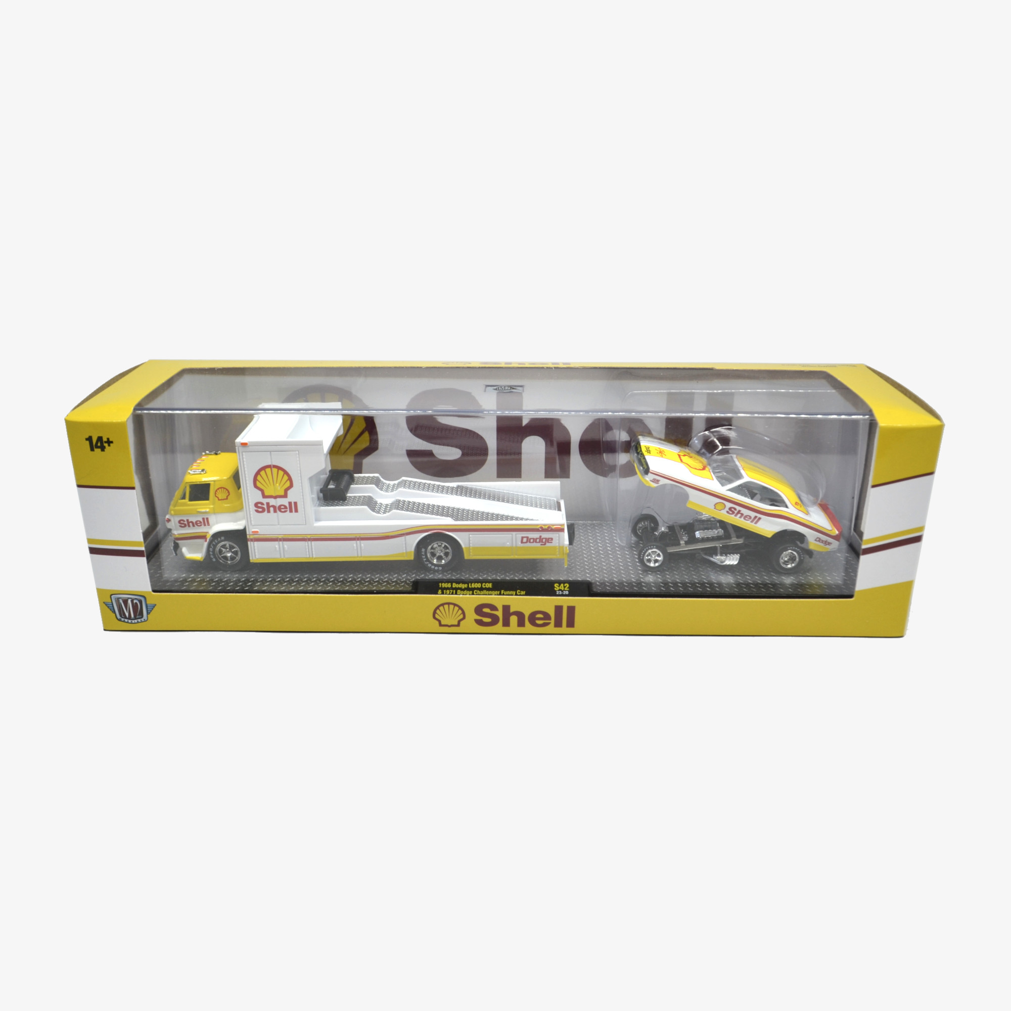This collectible display from M2 Machines features two die-cast vehicles: a 1966 Dodge L600 COE truck and a 1971 Dodge Challenger Funny Car. Both models, part of M2 Machines’ release S42, are 1:64 scale, with the truck measuring about 5.5″ long, and the car 3″ long. Both vehicles are white with yellow roofs and yellow details, and feature the Shell logo. The truck is available with either a silver-colored or gold-colored bed. This item was donated new in its original sealed box; the box shows some mild wear from storage.