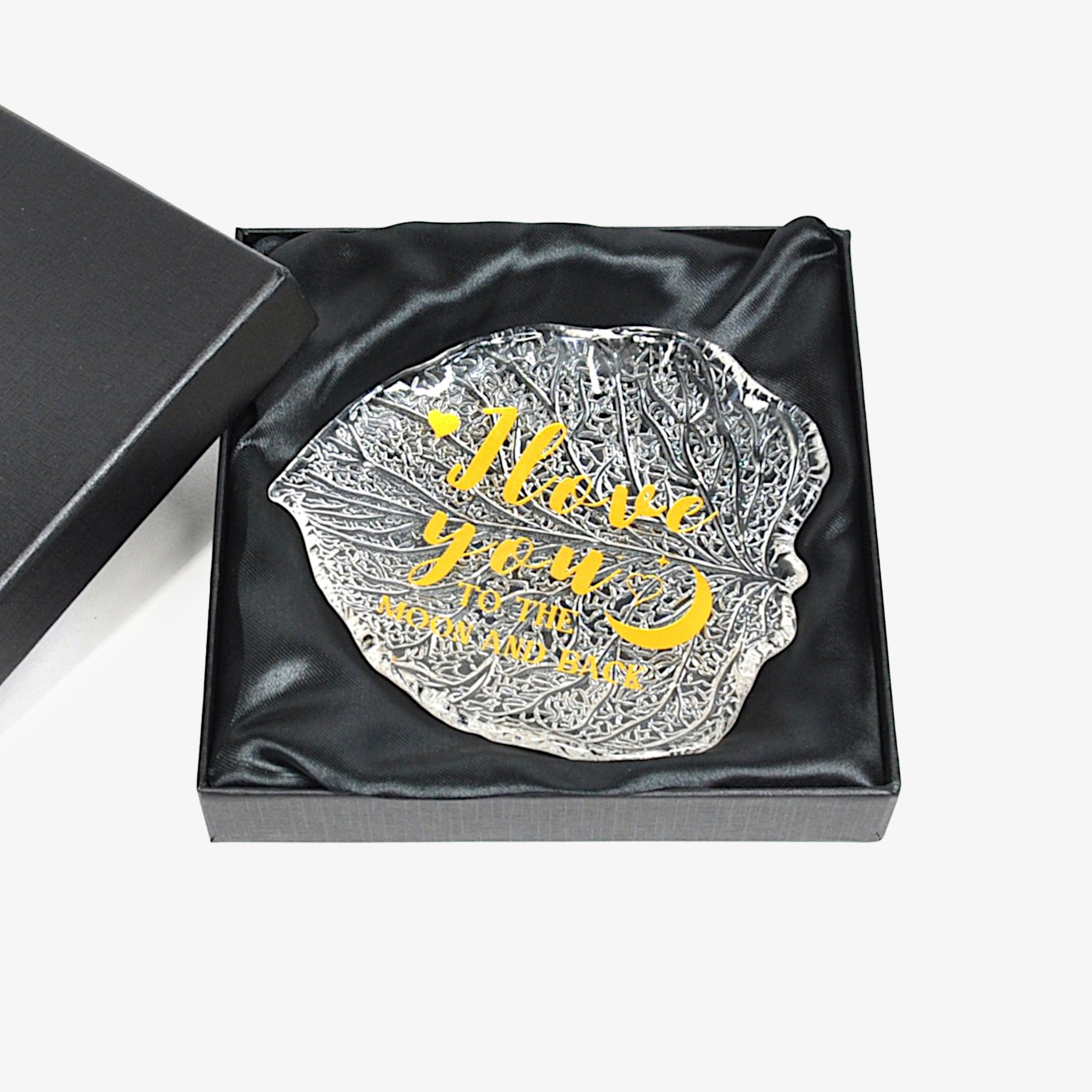 The dish features a heartwarming message printed in reflective gold. The phrase “I love you to the moon and back” is a classic expression of love and affection. The accompanying simple crescent moon design adds a touch of whimsy and completes the sentimental message. The reflective gold ink catches the light, adding a subtle sparkle and drawing attention to the loving words. This message makes the dish more than just a place to store jewelry; it transforms it into a cherished keepsake.