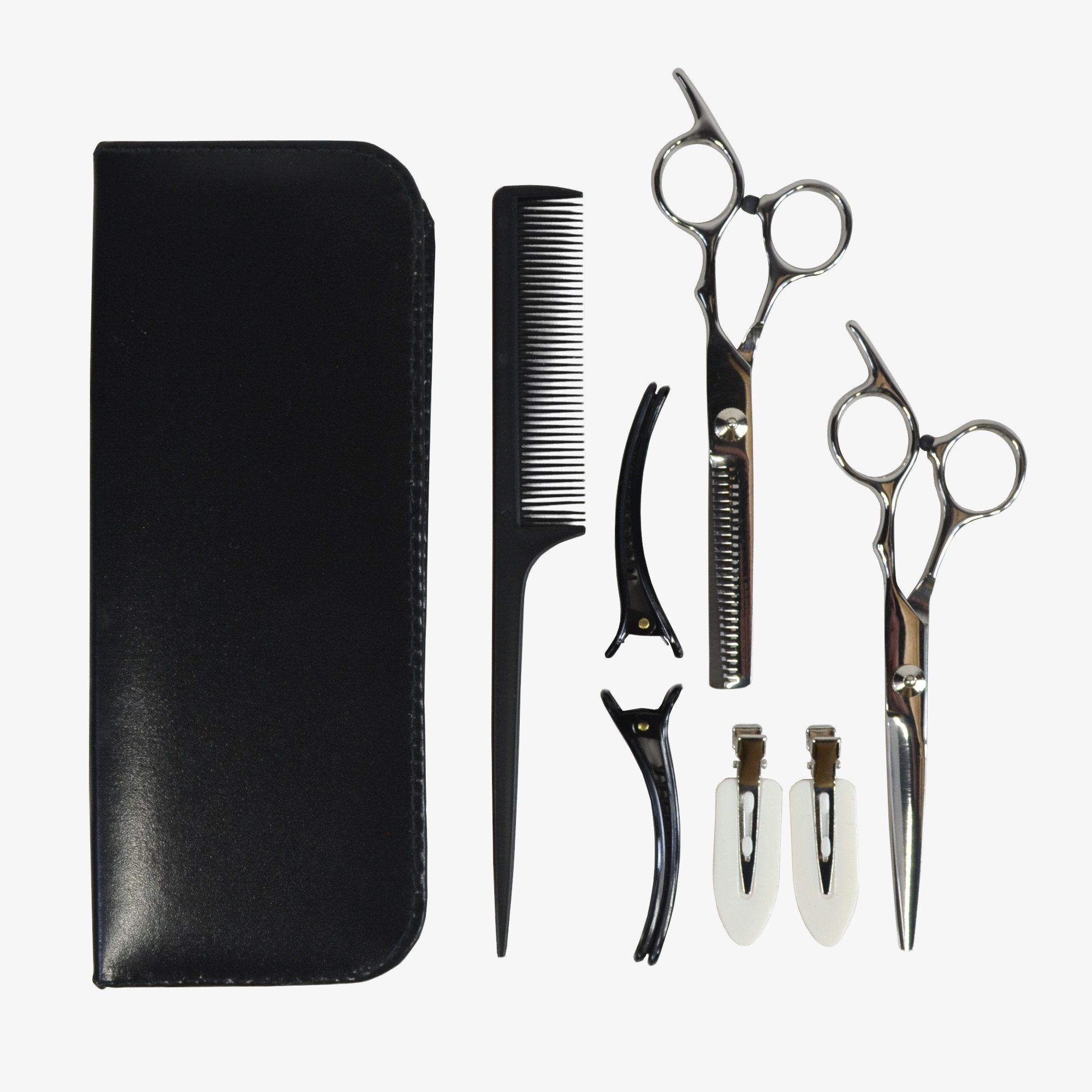 This seven-piece haircutting scissors kit provides the essential tools for trimming and styling hair at home or on the go. You receive one pair of chrome-plated shears with a 2.5″ blade for clean and precise cuts. The set also includes a pair of chrome-plated thinning shears to help you reduce bulk and blend different layers. A black 8″ comb features a 3.5″ teeth area to help you detangle and section hair with ease. For better control, the kit offers four hair clips in two different styles and colors. A donator provided these items brand new, although they do not come in the original factory packaging. Everything fits neatly inside a black faux-leather zippered case that measures 8.5L x 3.25W x 1.25″D.