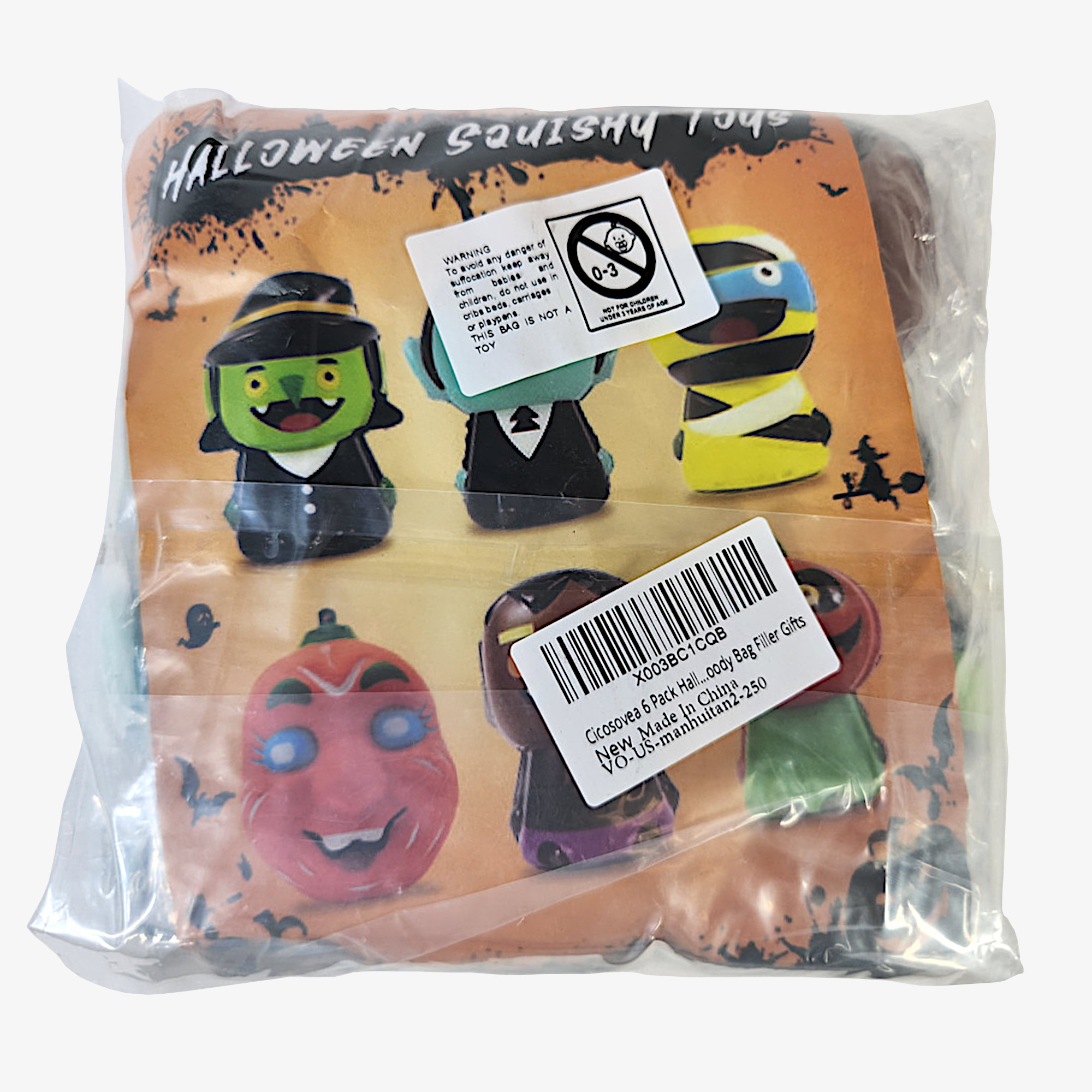 The set includes six squishy toys, each featuring a different Halloween-themed character. The characters include a vampire, a mummy, a jack-o’-lantern, a green fang guy, a brown fang guy, and a creepy pumpkin guy.
