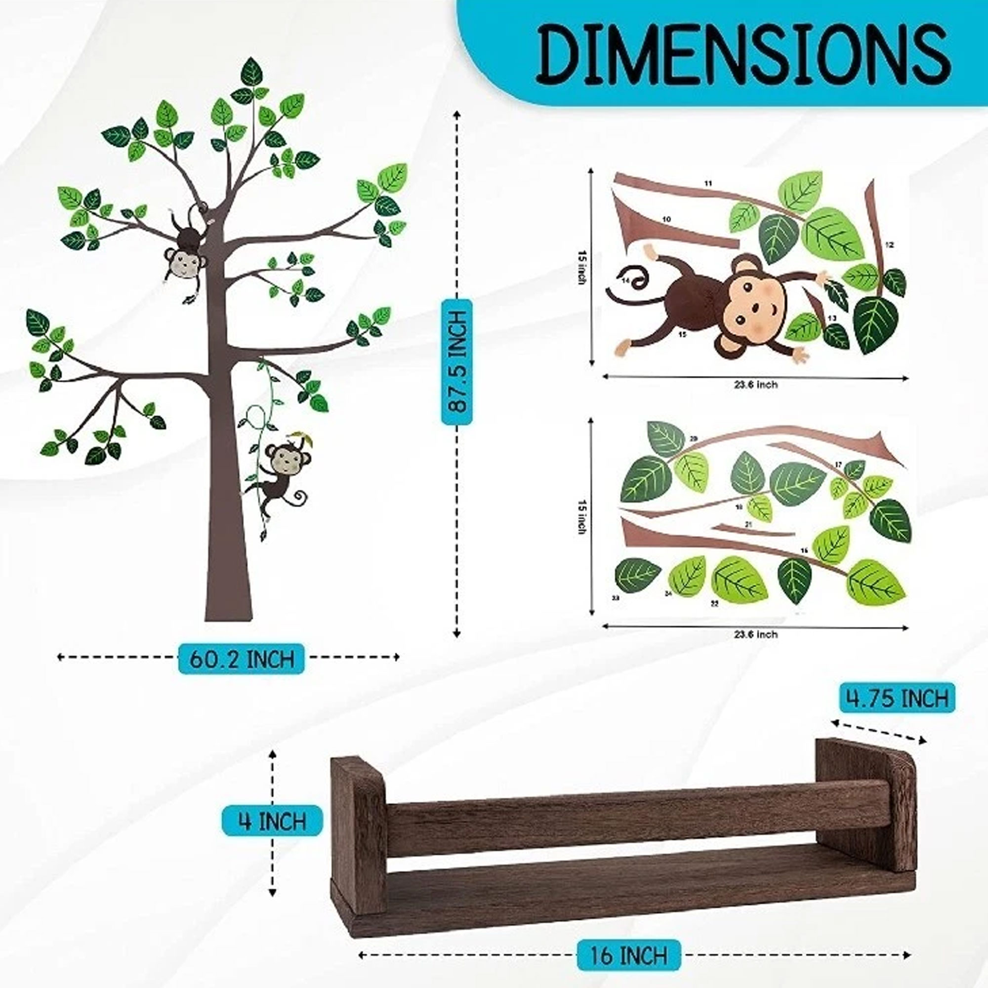 The kit includes three wooden shelves that you mount to the wall. The shelves are accompanied by a decal kit featuring a cartoon tree with two monkeys climbing on it. When the decal is placed on the wall behind the shelves, it looks like the shelves are resting on the branches of the tree, creating a whimsical and imaginative display.