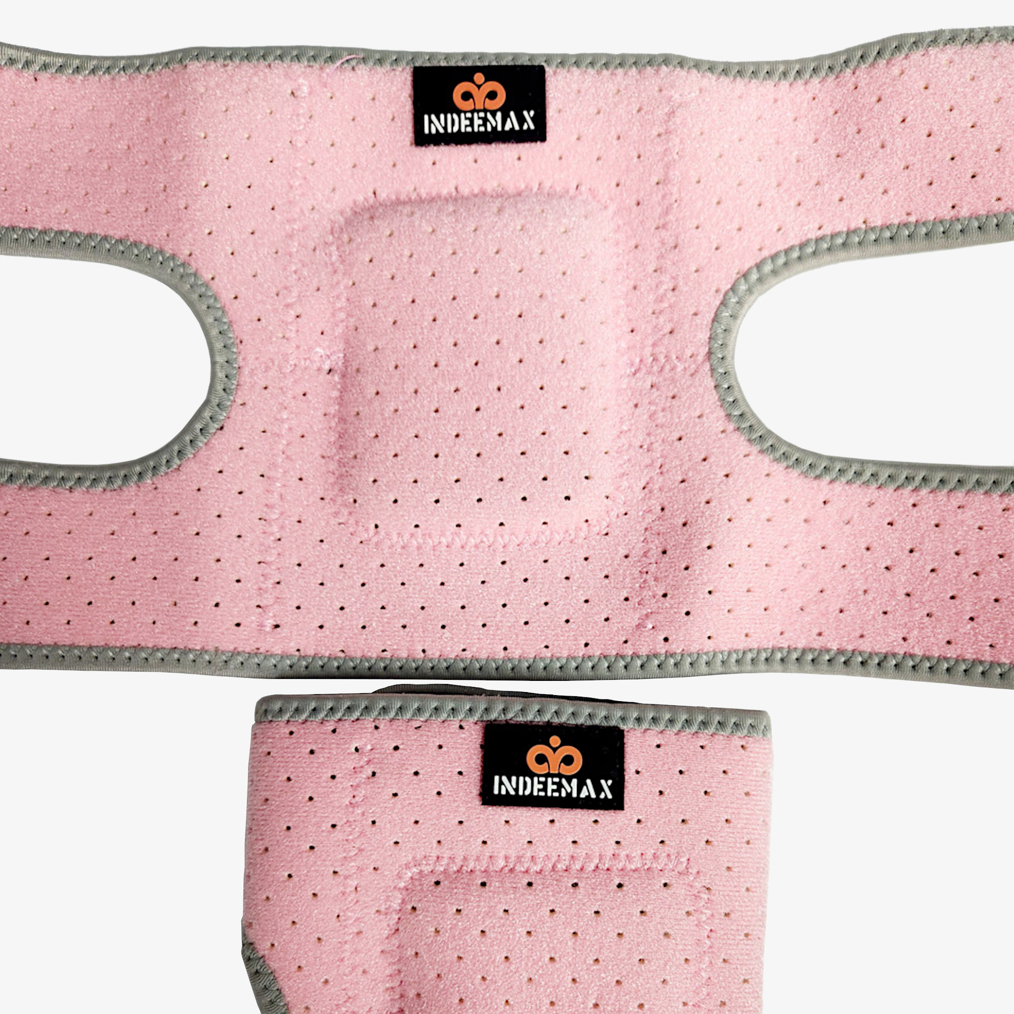 This pair of adjustable knee pads from Indeemax is a size X–XL. They are suitable for activities like bicycling, running, and dancing, offering support during many types of movement. A supporter donated this item new in its original package.