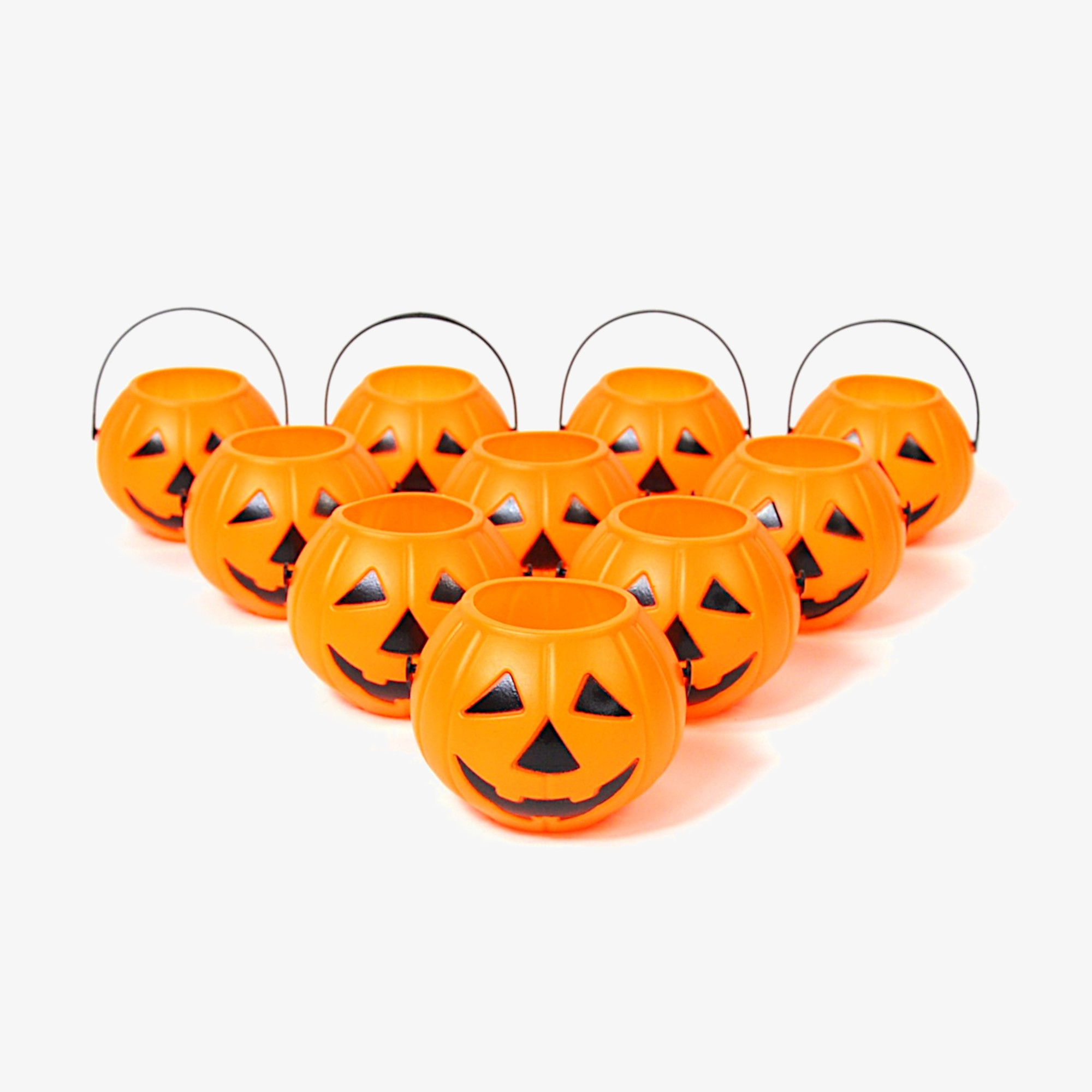 The pails are orange and black with a classic jack-o’-lantern face design. They are small and portable, making them perfect for trick-or-treating or handing out treats at parties.