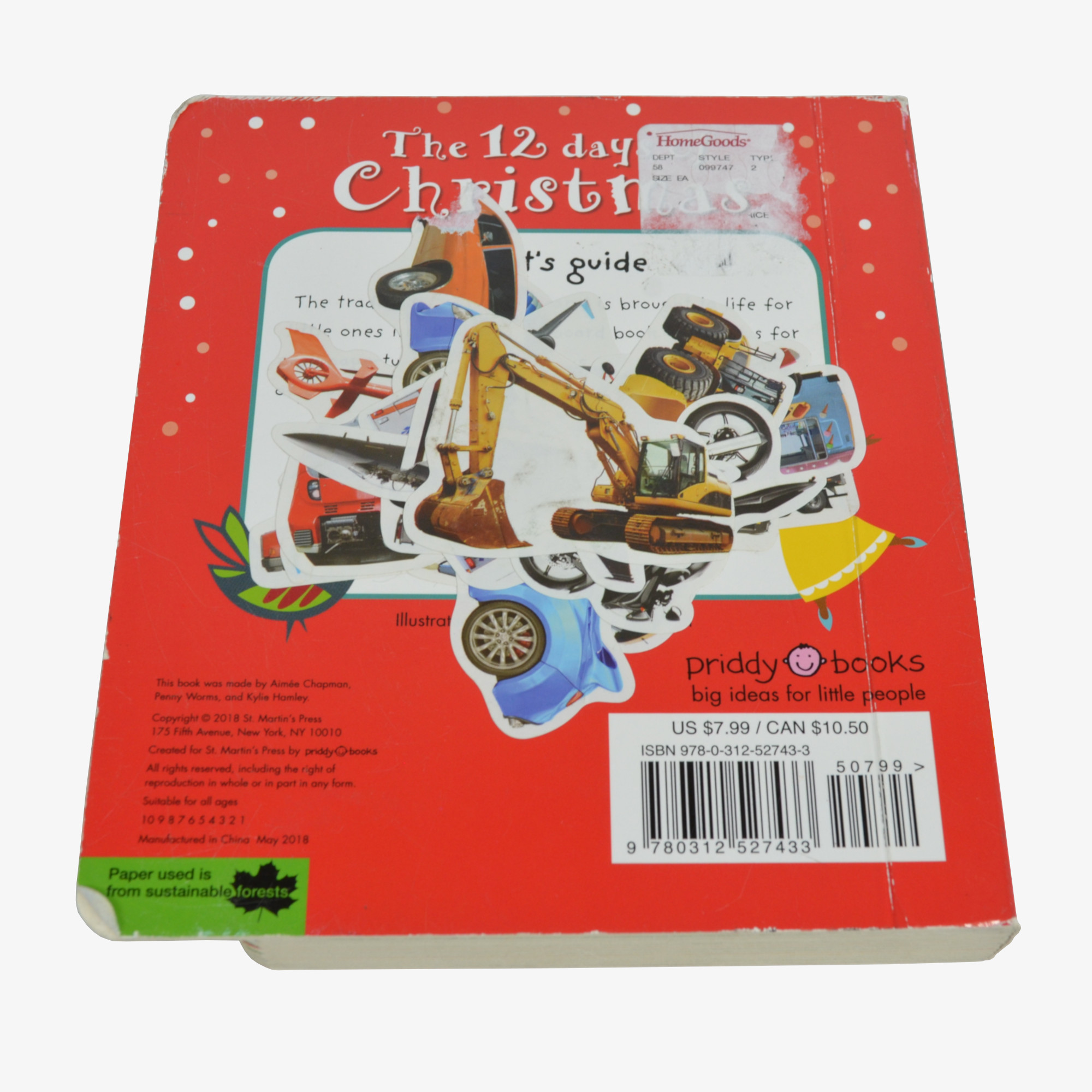 The 12 Days of Christmas is a 2018 board book made for toddlers. Colorful illustrations accompany the lyrics to the famous English carol. It is in good condition overall. However, several unrelated stickers stick to the back cover (see photo). The back cover also has residue from a HomeGoods price sticker. The covers have light abrasions and bumped corners. Still, it is in good enough shape for children to read with their parents.