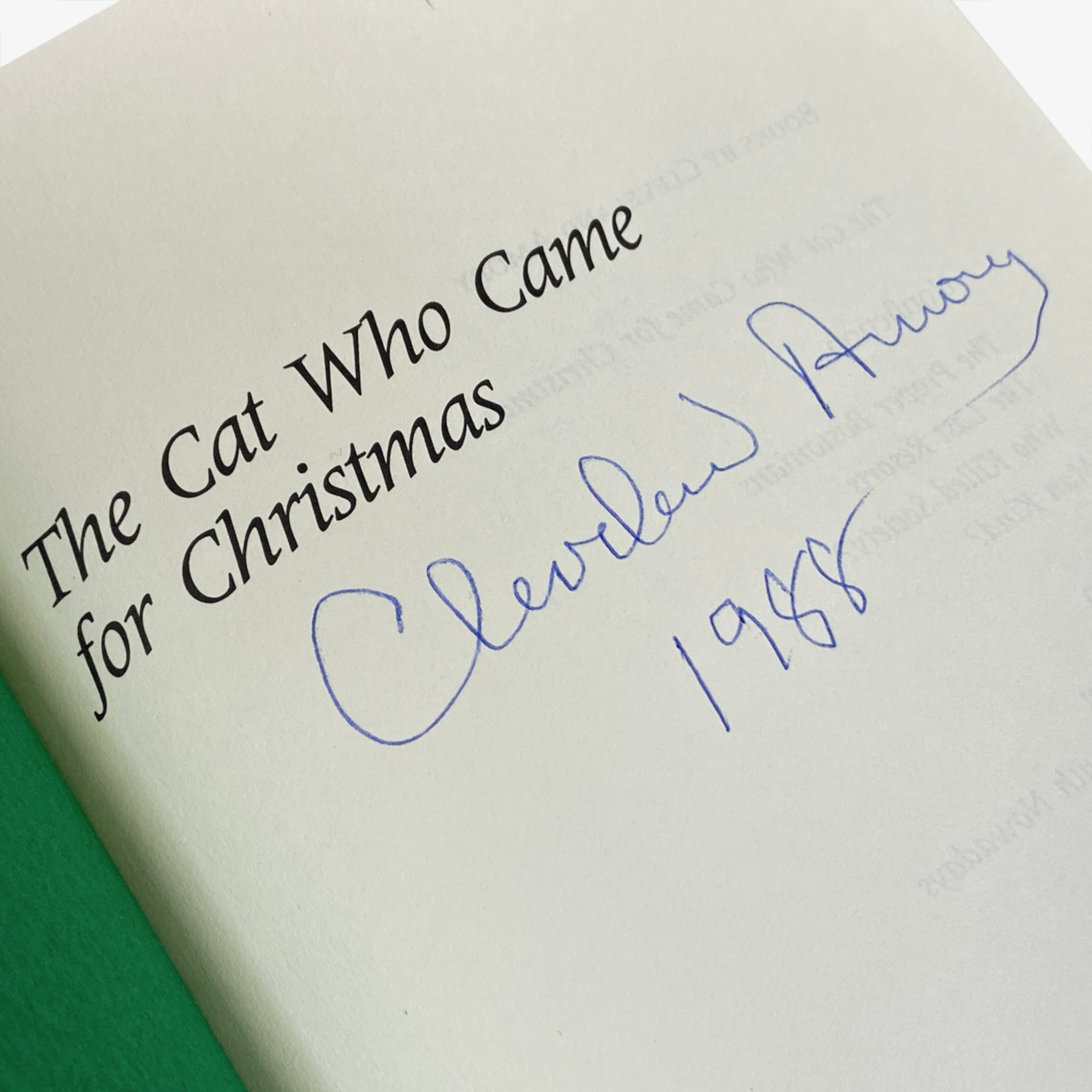 The Cat Who Came for Christmas is the first in a trilogy by Cleveland Amory. Amory was an American author who wrote much about animal rights. The book recounts how he rescued and adopted a cat named Polar Bear. You will find this hardback copy in very good condition overall. Furthermore, this specific copy is signed by the author (see photo). The inscription reads, “Cleveland Amory | 1988.” The dust jacket, in good-minus condition, shows some mild creasing, abrasions, and small surface tears.