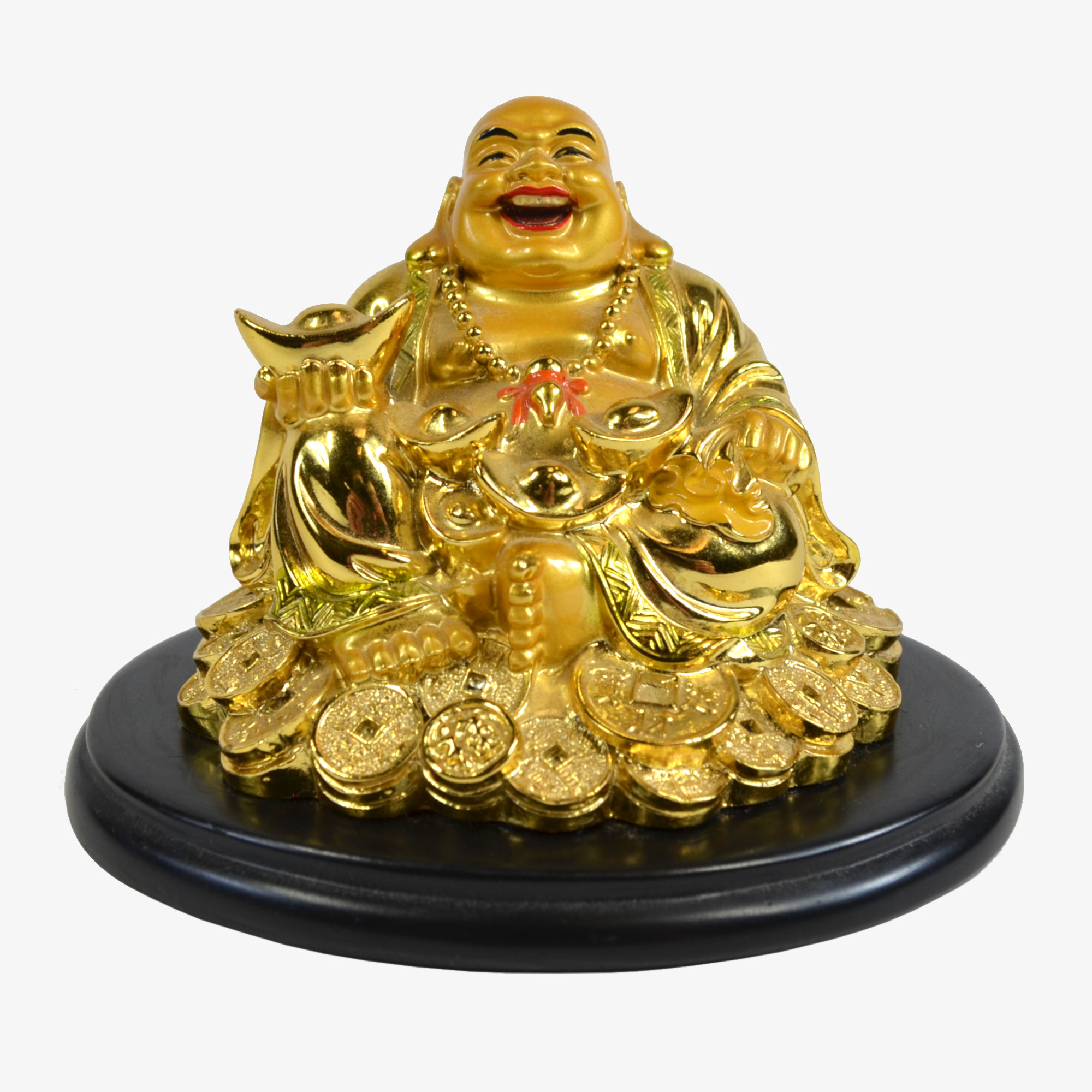 The figure showcases many traditional symbols associated with wealth and happiness. Budai wears a gold robe and a necklace around his neck. He carries a gold ingot in his right hand. In his left hand, he holds a large sack that likely contains more gold or coins. The monk sits directly upon a pile of gold Chinese coins. These elements traditionally represent abundance, prosperity, and good luck in many cultures. His trademark smile reflects a sense of contentment and peace. The intricate details on the coins and robe add a nice texture to the sculpture.