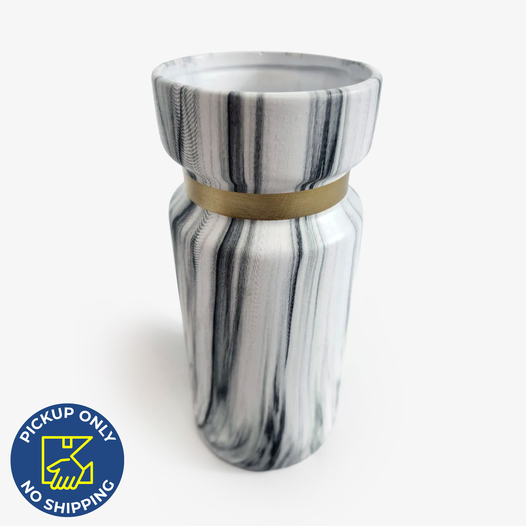 Made of white ceramic, this vase features a textured marble design. The marble design is made up of streaks of dark gray, creating a unique look.