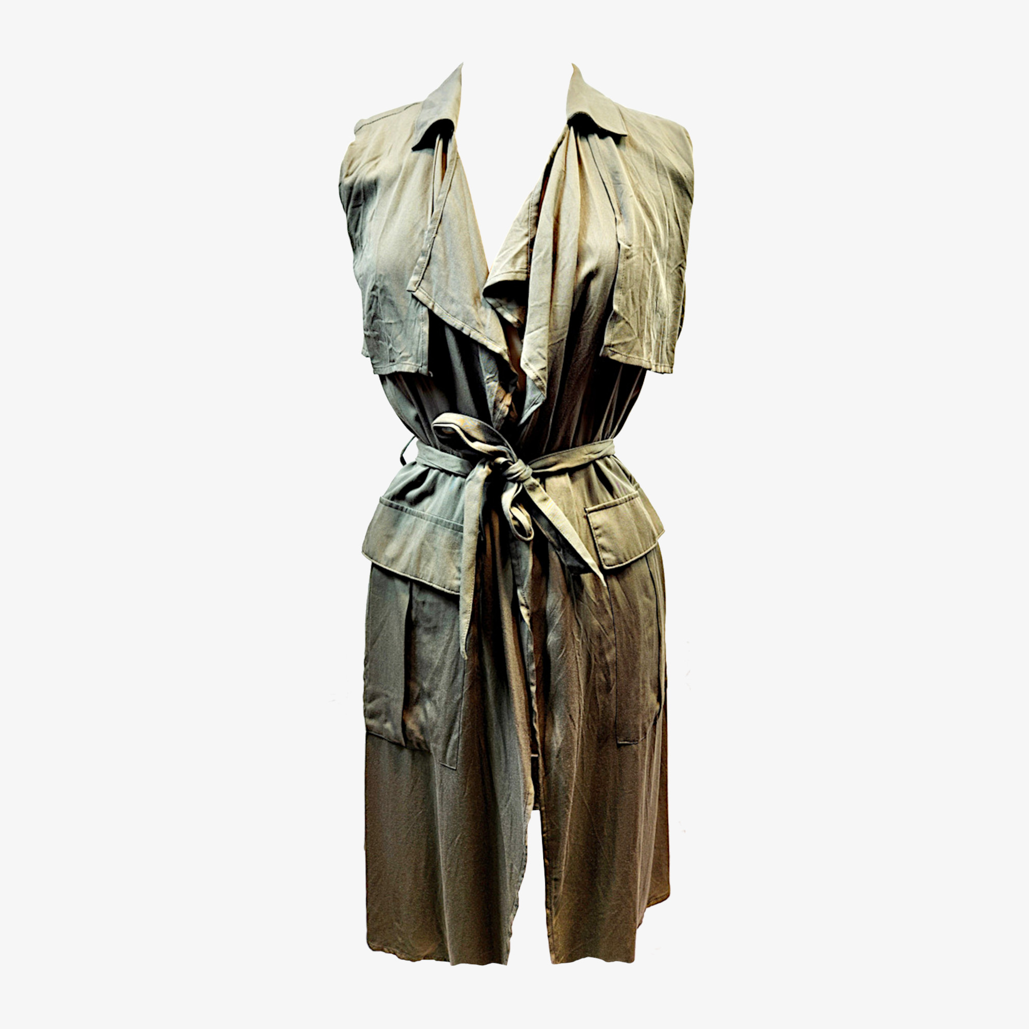 This women’s Mossimo duster jacket is a size small. It is sleeveless and comes in a solid olive green color. In addition, it has a belt at the waist to cinch it. Two large pockets appear on the front. It is about mid-thigh to knee length and is made from 100% rayon. This jacket was donated new with its tag still attached.
