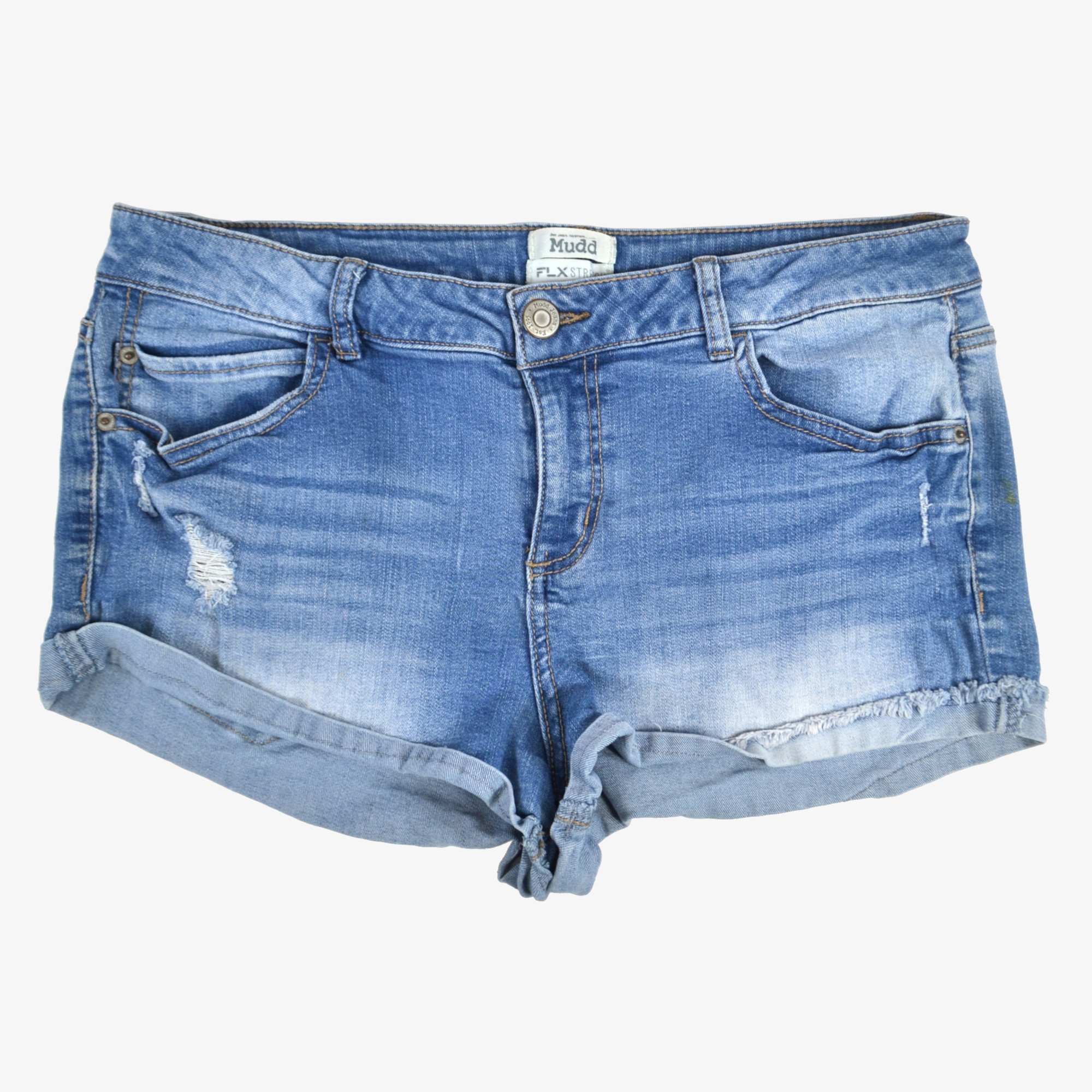 These Mudd denim shorts offer a stylish, distressed look. The shorts feature a blue washed appearance, with three distressed holes on the front and one on the back left pocket. They have a cuffed and cut-off hem. FLX Stretch fabric adds comfort. This pre-owned pair is in excellent condition.