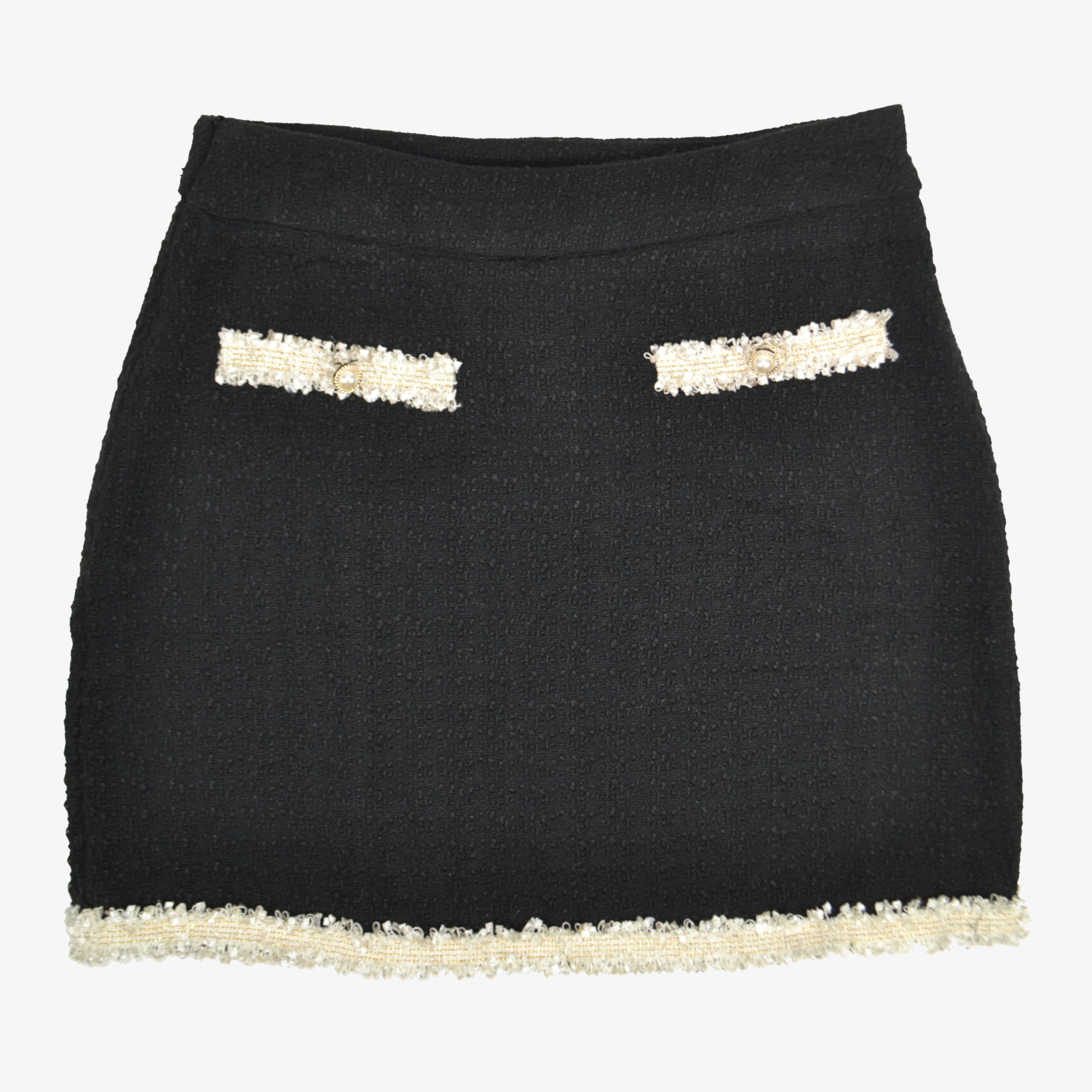 The black bouclé fabric gives this miniskirt a sophisticated look. The off-white trimming creates a lovely contrast. Faux pearl details on the faux pockets add a touch of charm. These elements combine elegance with playful details. The design makes this skirt a versatile choice. It transitions easily from day to night.