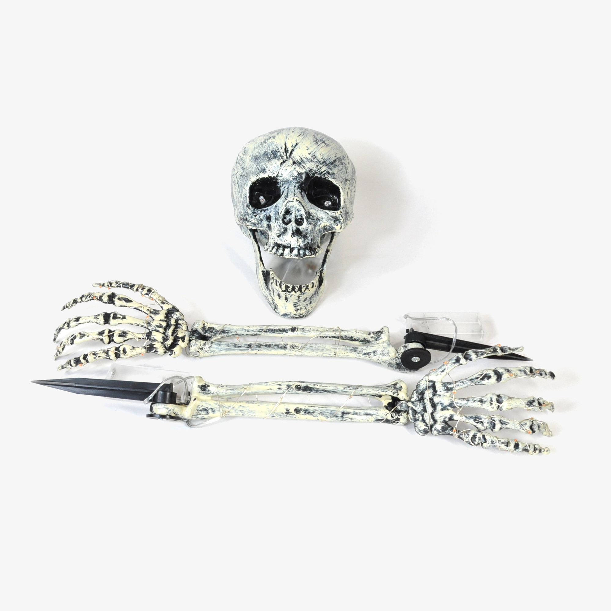 - Skull and Bones: The Light-up Skull and Bones set includes a skull and two skeleton arms. You can stick the arms into the yard, making it look as if a creepy animated skeleton is crawling out of the ground. The pieces illuminate with LED lights for a spooky glow.