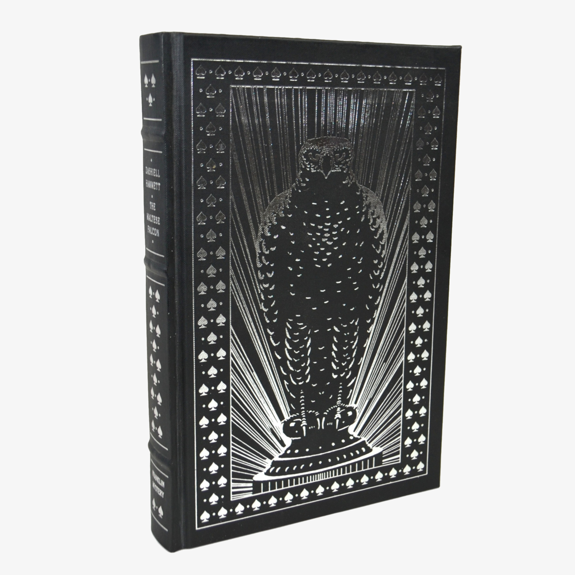 This deluxe hardback 1987 edition of The Maltese Falcon offers a classic detective story. The Franklin Library published this special volume. It features a black faux leather cover, and silver foil-stamped illustrations adorn both the front and back. Furthermore, the book boasts elegant silver-gilded edges. This pre-owned copy remains unread, with mostly clean pages and edges—a true find for collectors.