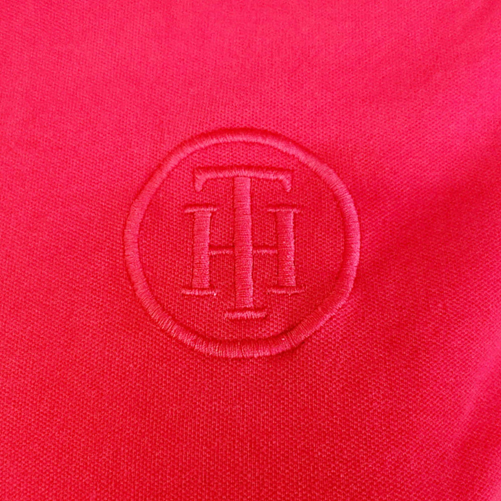 This pre-owned Tommy Hilfiger Women’s Red T-shirt is a size medium. It features a solid red color with a matching red embroidered TH logo on the left breast. This classic crew-neck shirt remains in good condition, showing light wear.