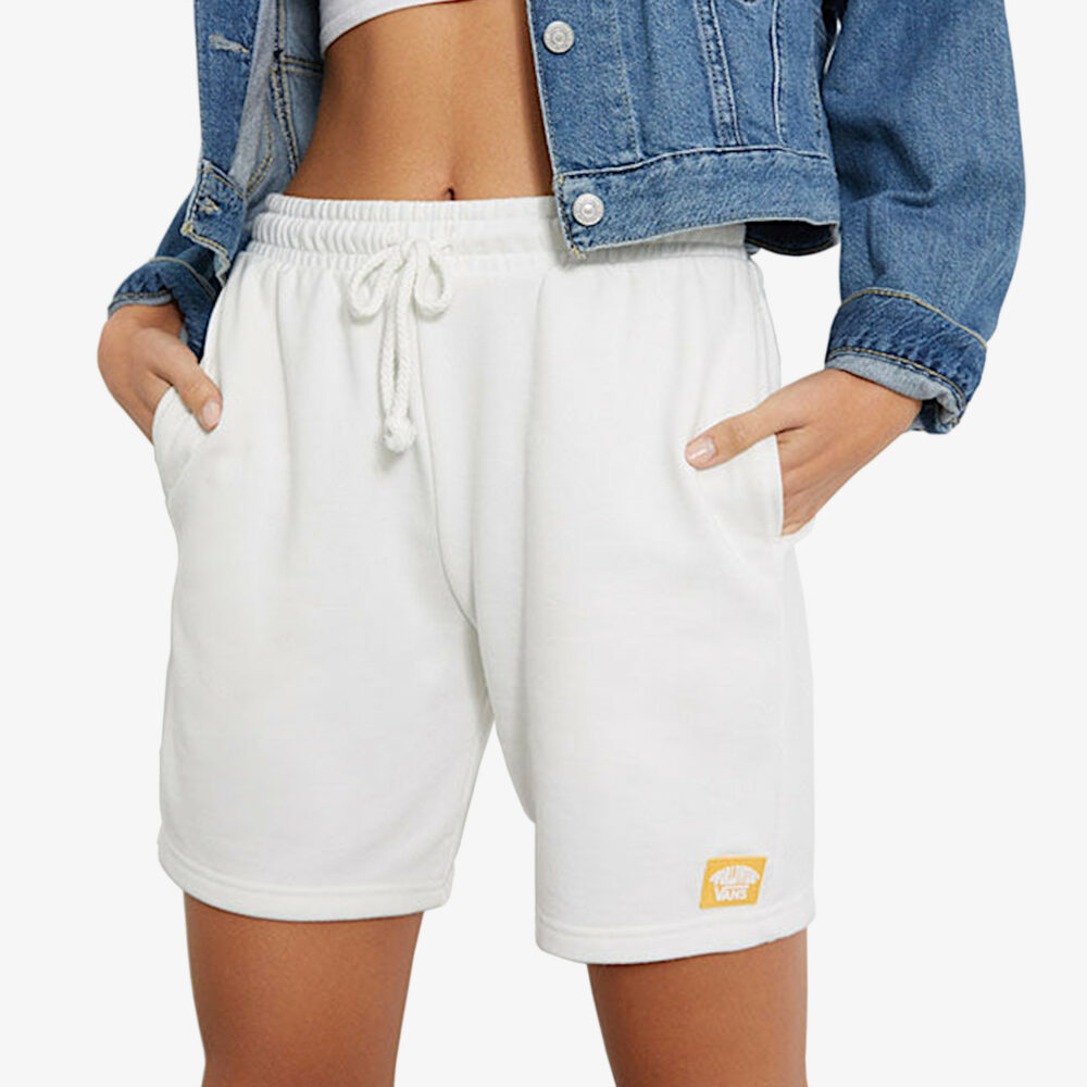 These Vans Women’s White Sweat Shorts offer ultimate comfort and relaxed style. They feature a high-waisted design, providing a modern look. A longer inseam adds extra comfort. These shorts also include a custom silicone Vans label at the hem. A drawstring elastic waistband ensures a flexible fit. Practical side pockets offer convenient storage. You will also find a back pocket for essentials. Donated new with tags, these solid white shorts are a fresh find. The waist tag has a markdown mark over the Vans logo (see photo).